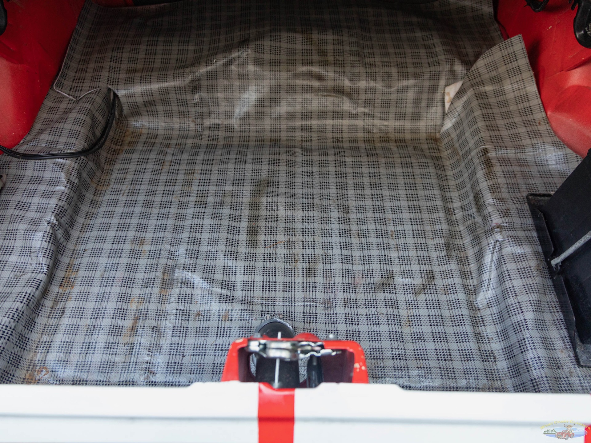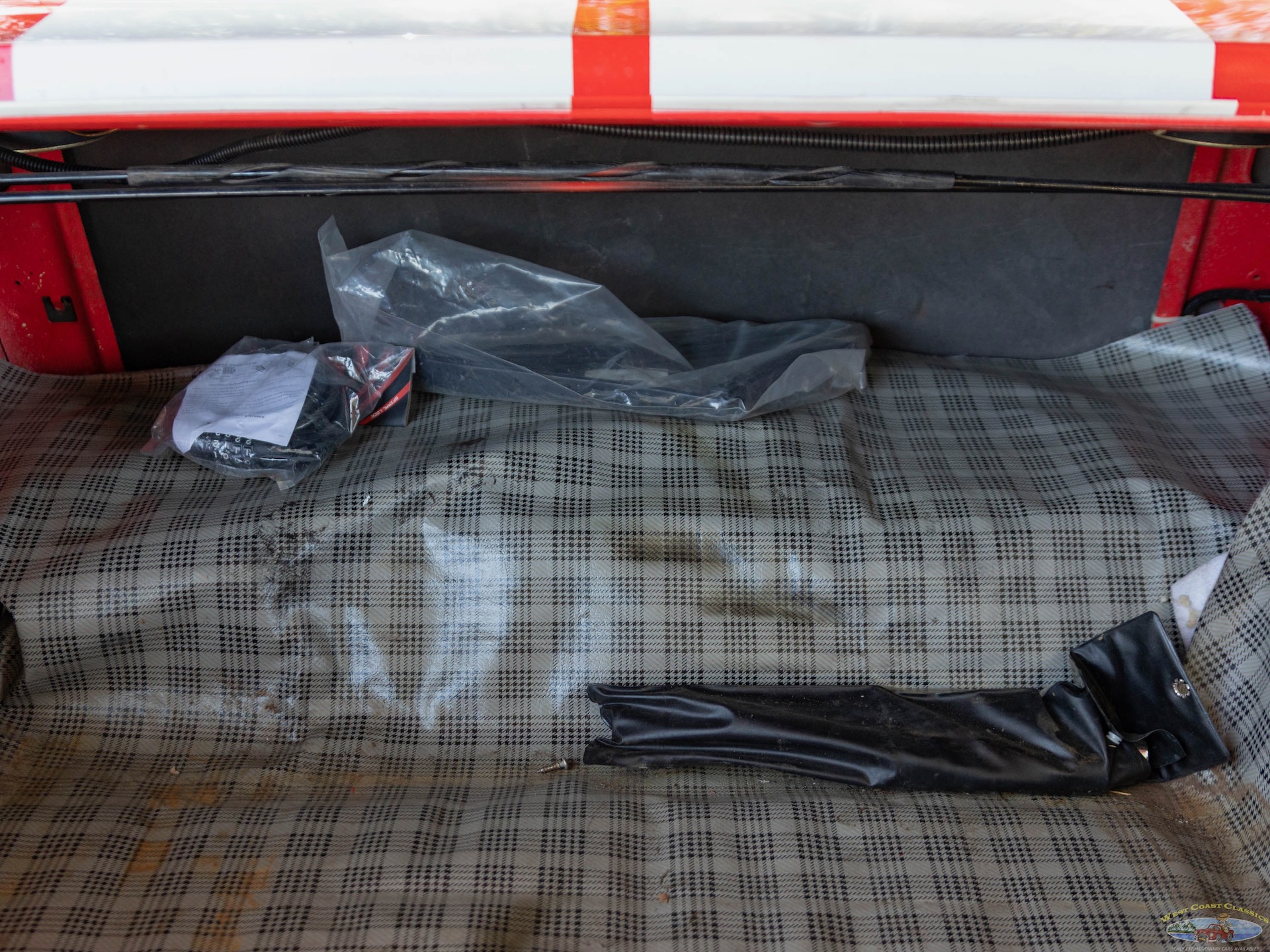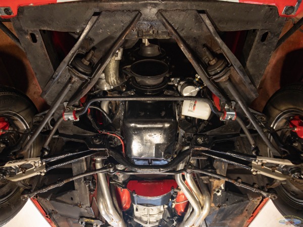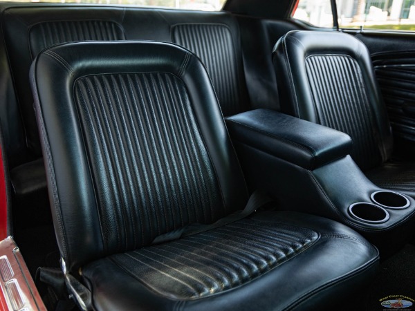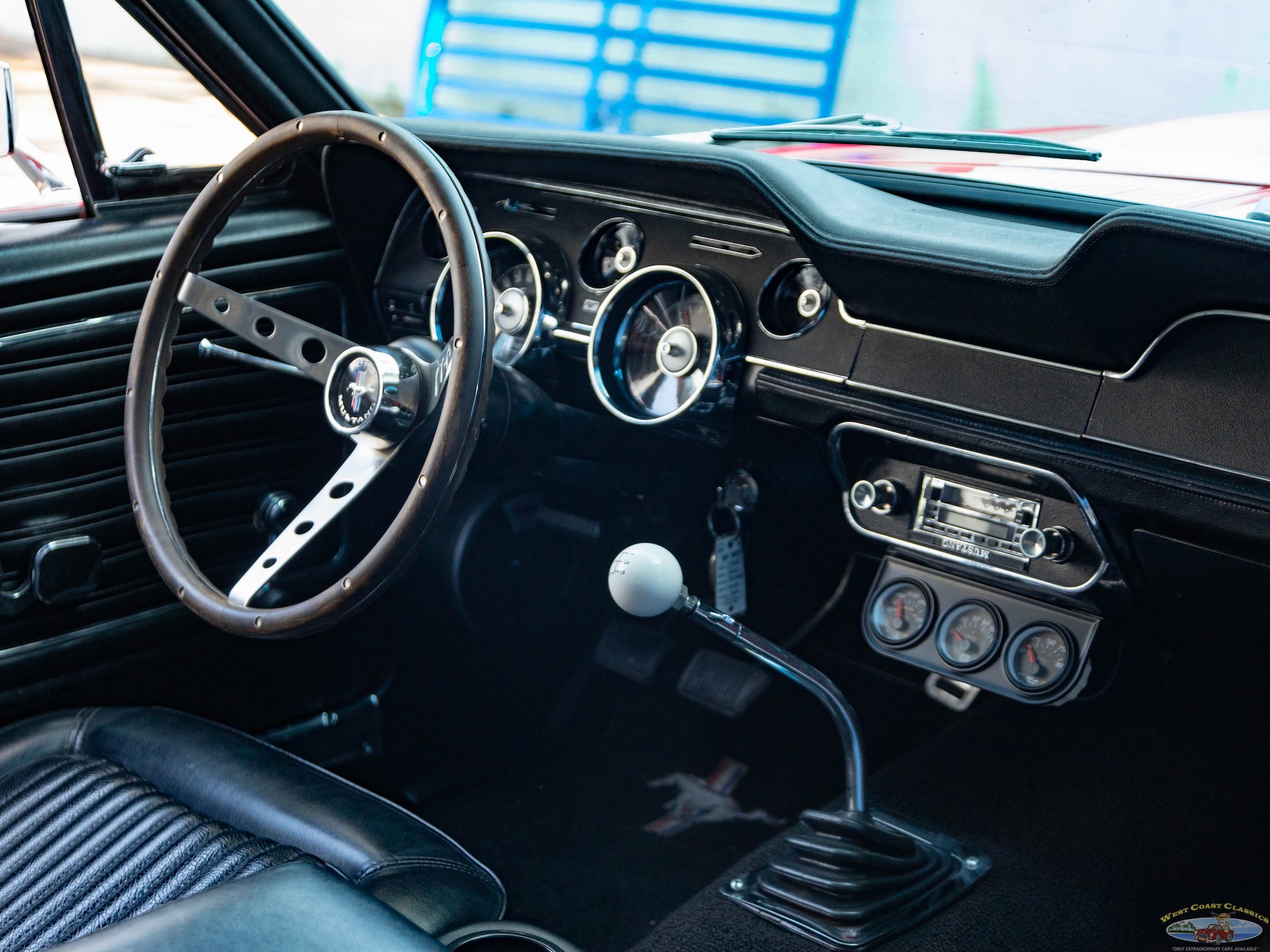 The Black bucket seats interior with matching carpeting, upholstery, door panels, and dash and more modern upgrades including an armrest center console with cup holders and a wood steering wheel and shift knob and a fully upgraded digital gauge package.
