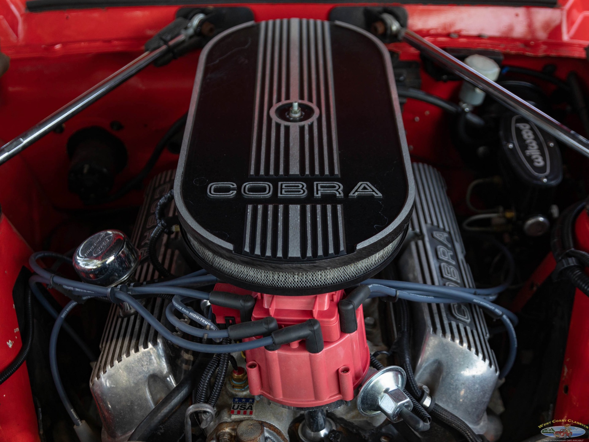 Featuring Shelby influenced upgrades including competition-style Torque Thrust wheels and a GT350-style lightweight fiberglass hood with painted racing stripes.