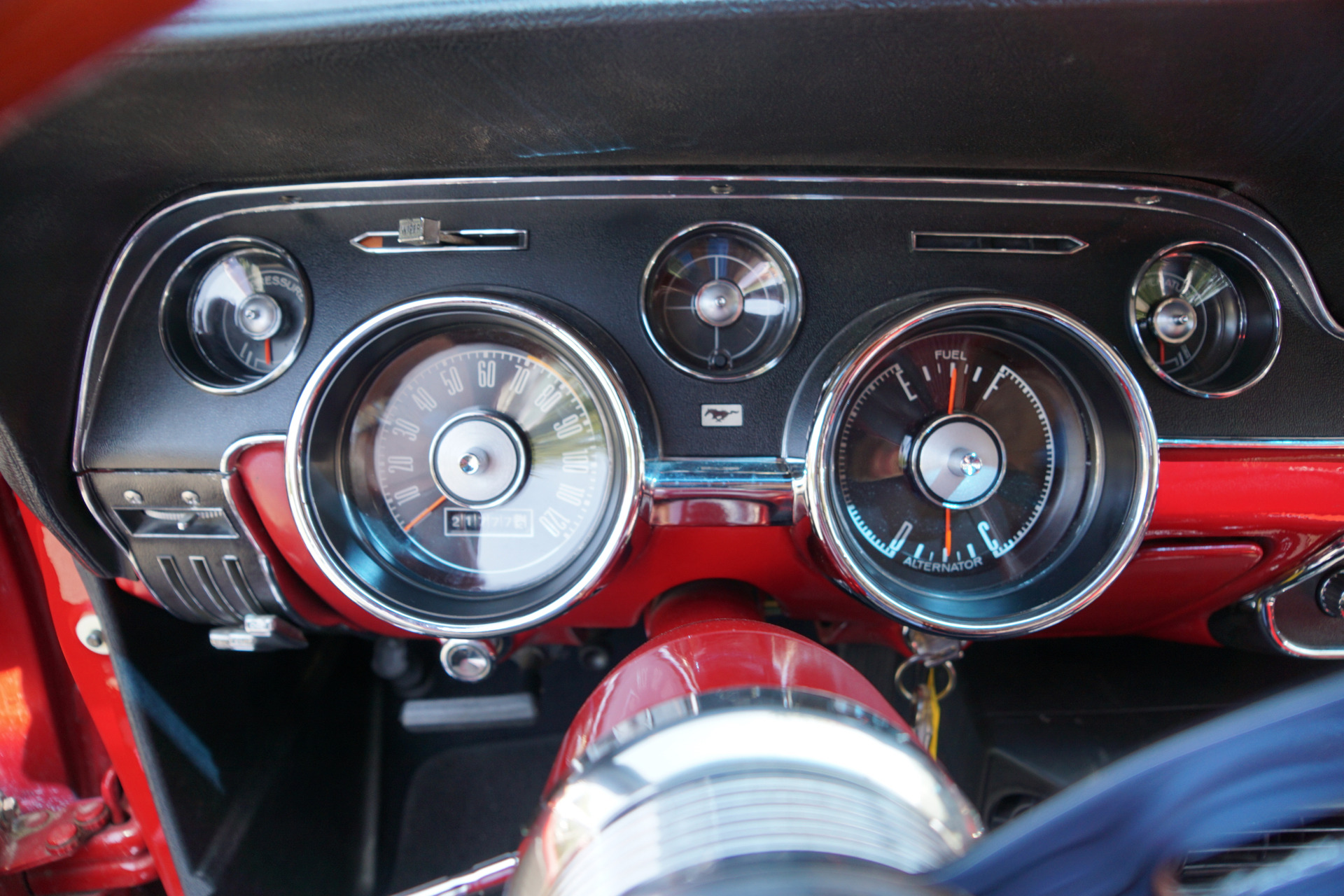 It has a very striking repaint in Red with a matching two tone custom Red and Black interior, original C4 Select Shift Cruise-O-Matic automatic transmission, new 'American Racing' chrome wheels with new 'Futura GLS Super Sport' tires, an after market 3 spoke custom steering wheel, after market air conditioning and a modern vintage style Mustang radio/cassette.