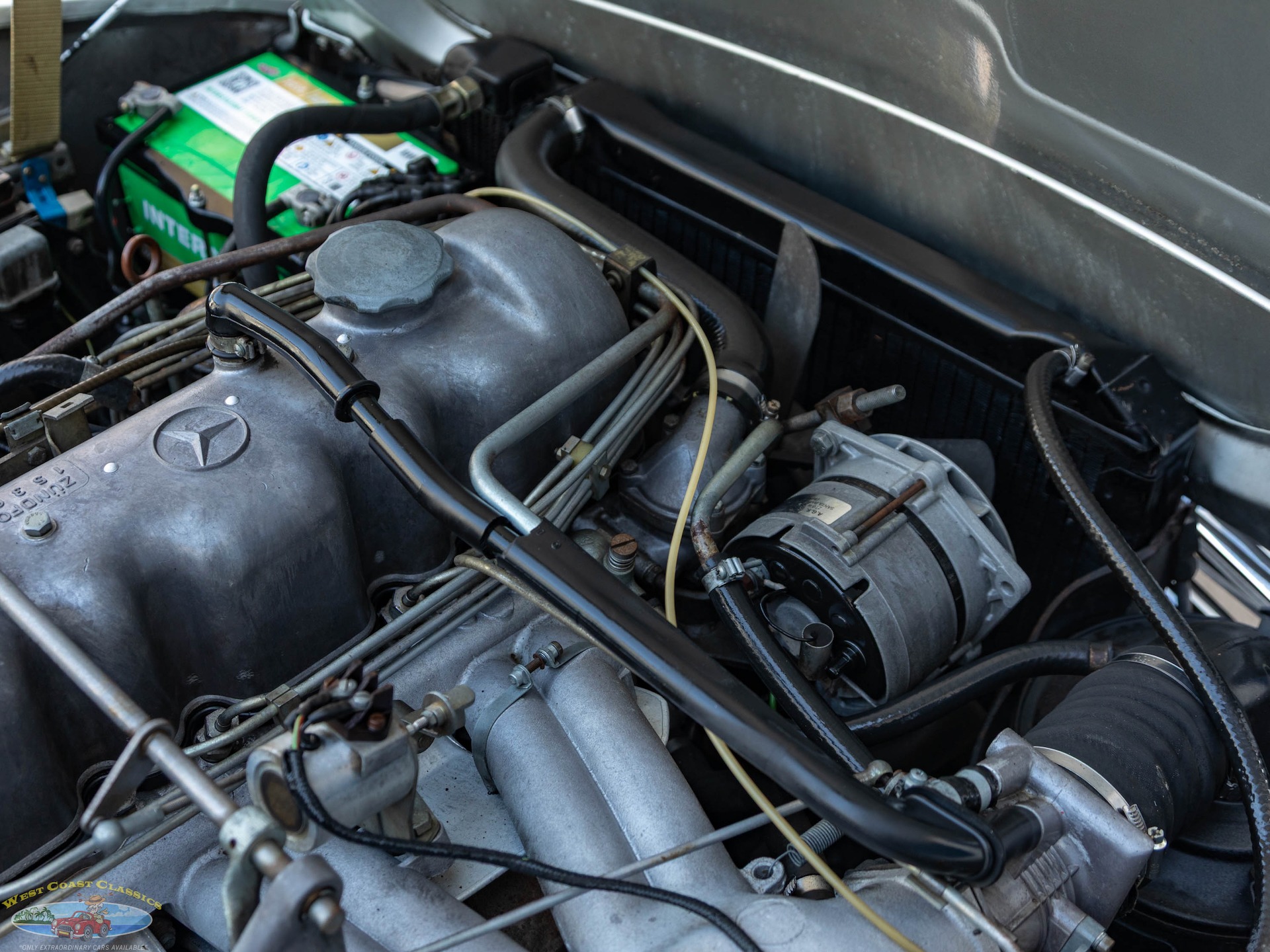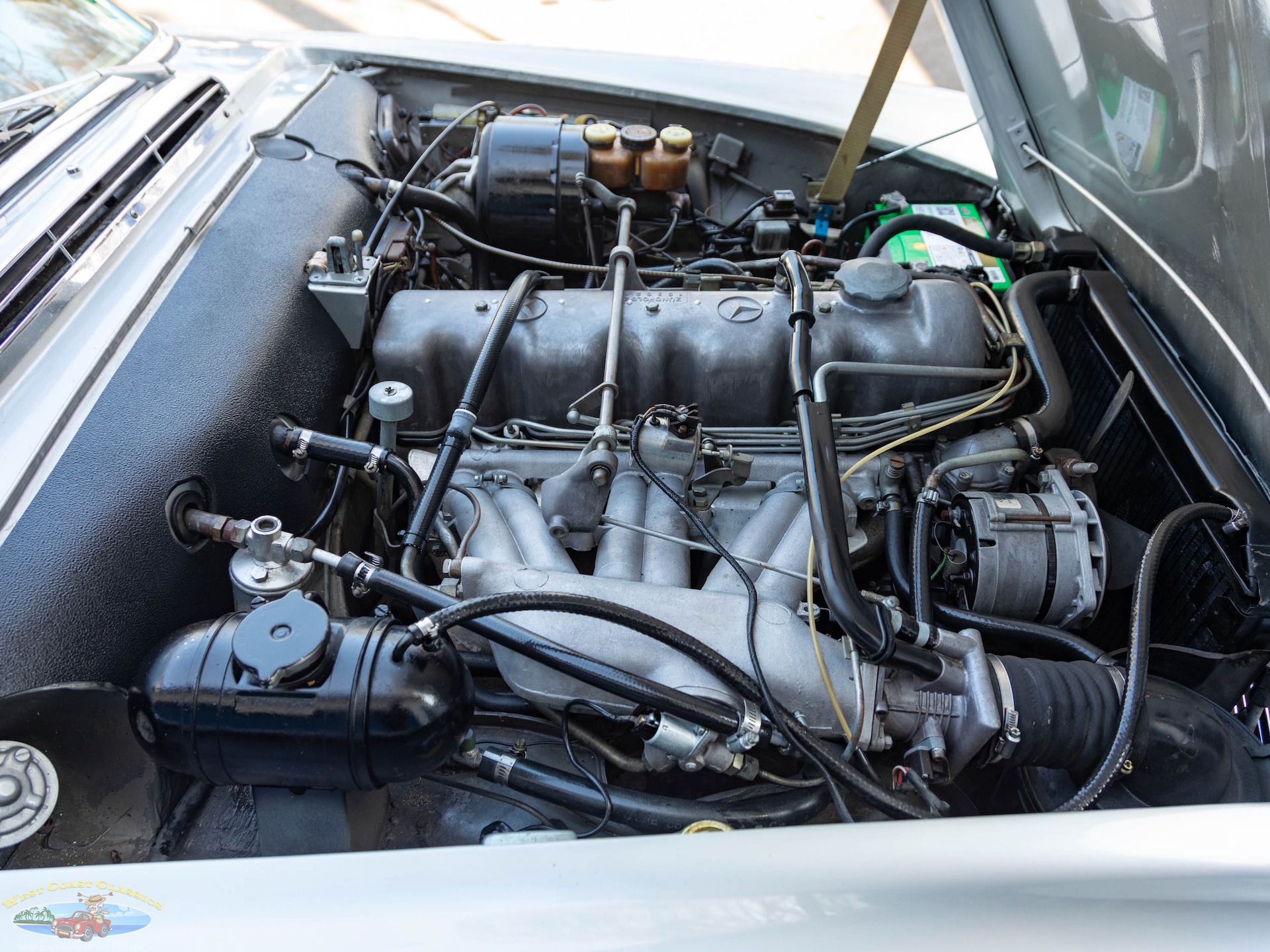 All models were equipped with an inline-six cylinder engine with multi-port fuel injection, power disc brakes on all four corners, adjustable bucket seats, radial tires and an electric clock! The hood, trunk lid, door skins and tonneau cover were all made of aluminum to reduce weight. The comparatively short and wide chassis, combined with an excellent suspension, powerful brakes and radial tires gave the W113 superb handling for its time. The styling of the front, with its characteristic upright Bosch 'fishbowl' headlights and simple chrome grille, dominated by the large three-pointed star in the nose panel, paid tribute to the then already legendary 300 SL roadster.