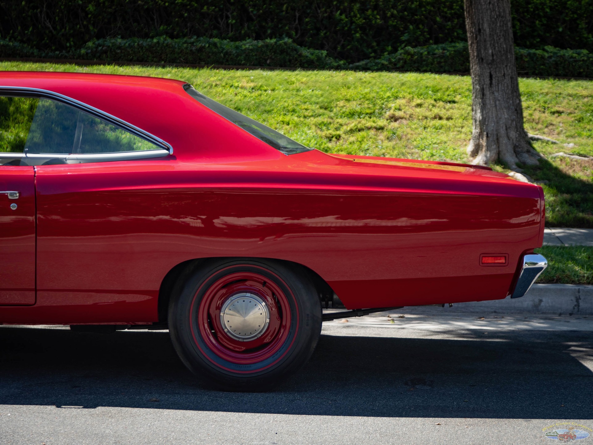 The car was completely taken apart and a date correct replacement Hemi engine block with casting # 2468330 was installed with all other parts believed to be true to the car. The original block is not longer available. The car was stripped down to bare metal, removing all windows etc. The original fender tag was removed and replaced with a reproduction tag but the original is still available and will be sold with the car. The car was repainted in correct 'Scorch Red' as per the VIN fender tag with a 'Pewter' interior also reinstalled as per VIN. The restoration took approximately two years to finish in 2004, at which time the previous owner had purchased the Roadrunner.