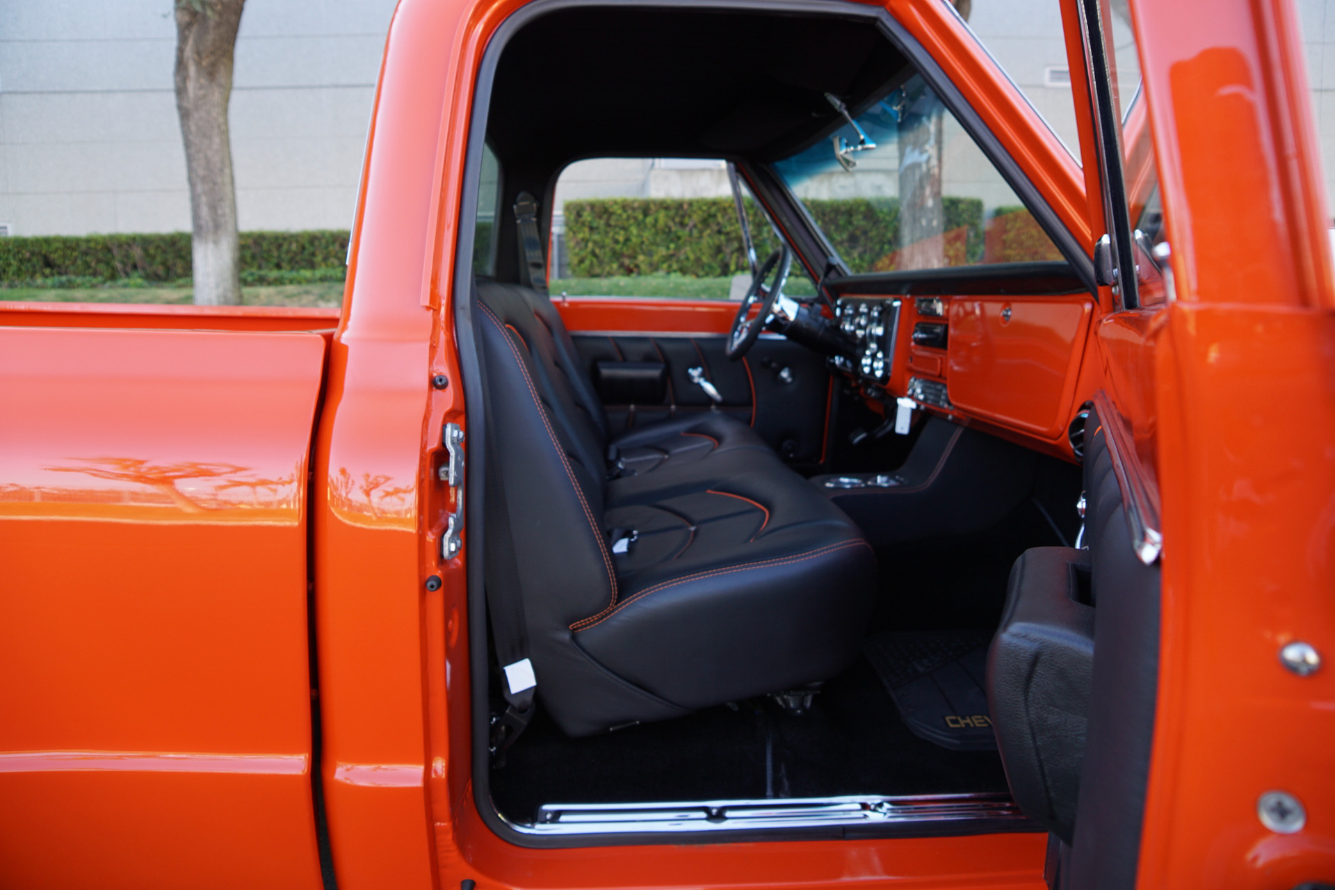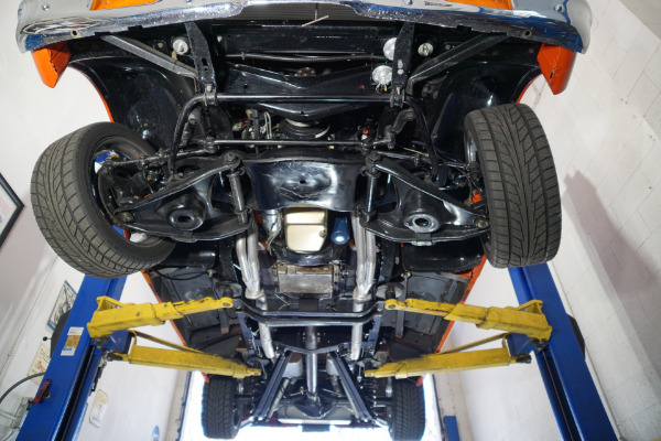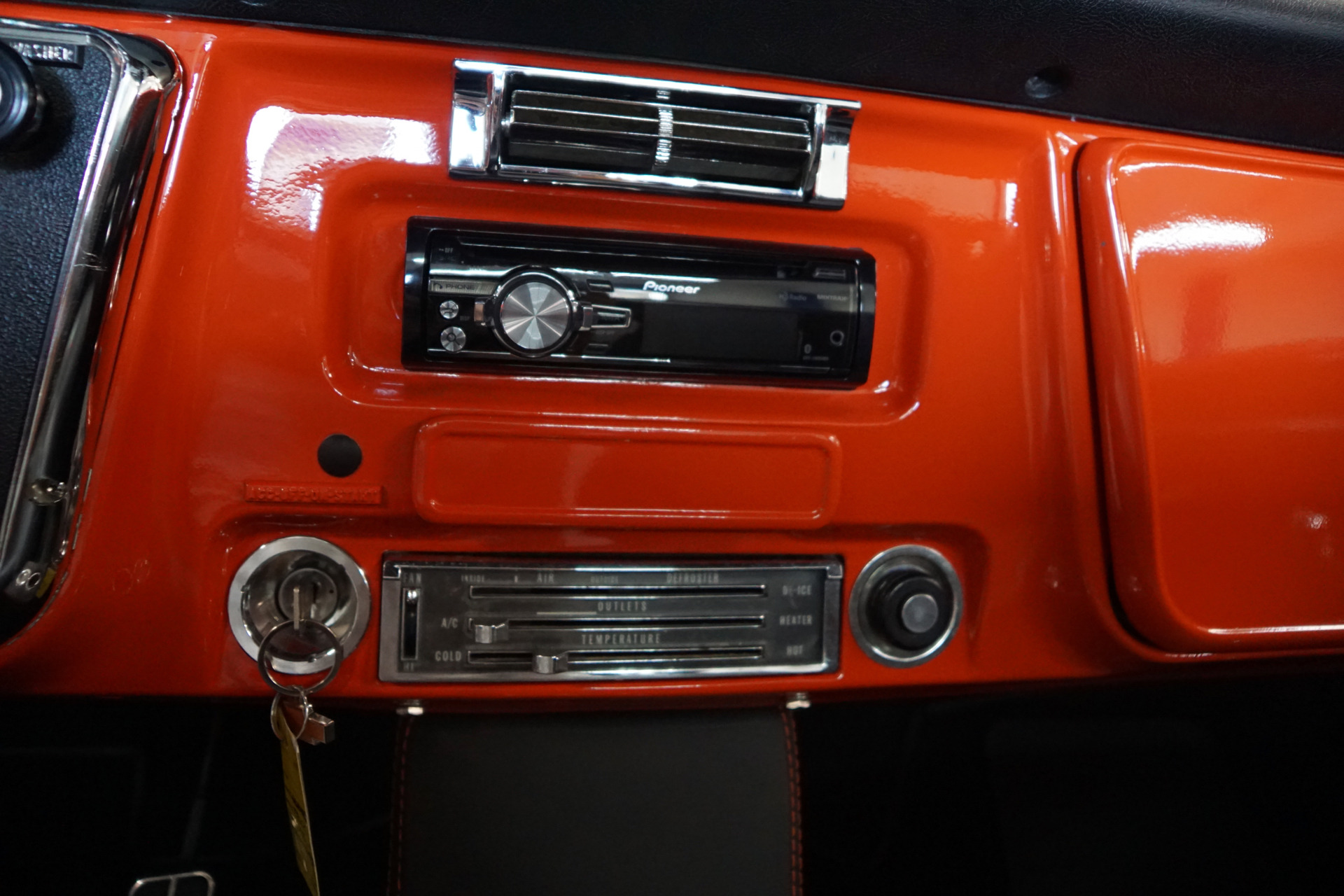 Finished in 'Hugger Orange' paint with a custom interior by renown and award winning 'Ron Mangus Custom Hot Rod Interiors'. Black leather with Orange Piping and custom cup holder. new headliner, carpet & seatbelts. Custom sound system with 1000 watt 'Rockford Fosgate' stereo system with 2 -10" woofers, tweeters & mids. Pioneer dash unit. Original gauge dash with custom steering wheel.