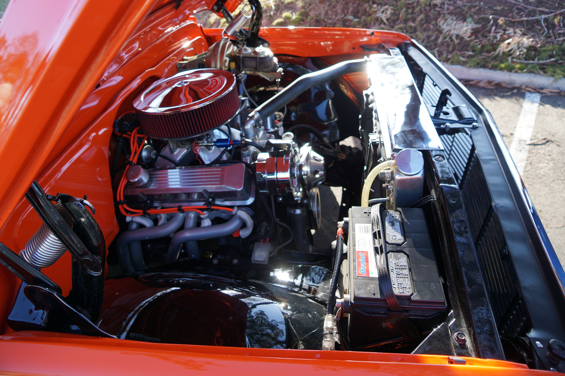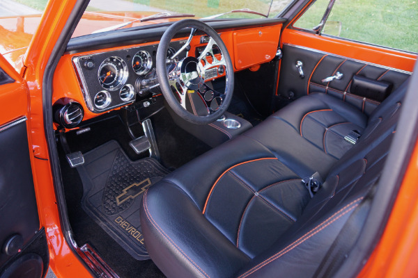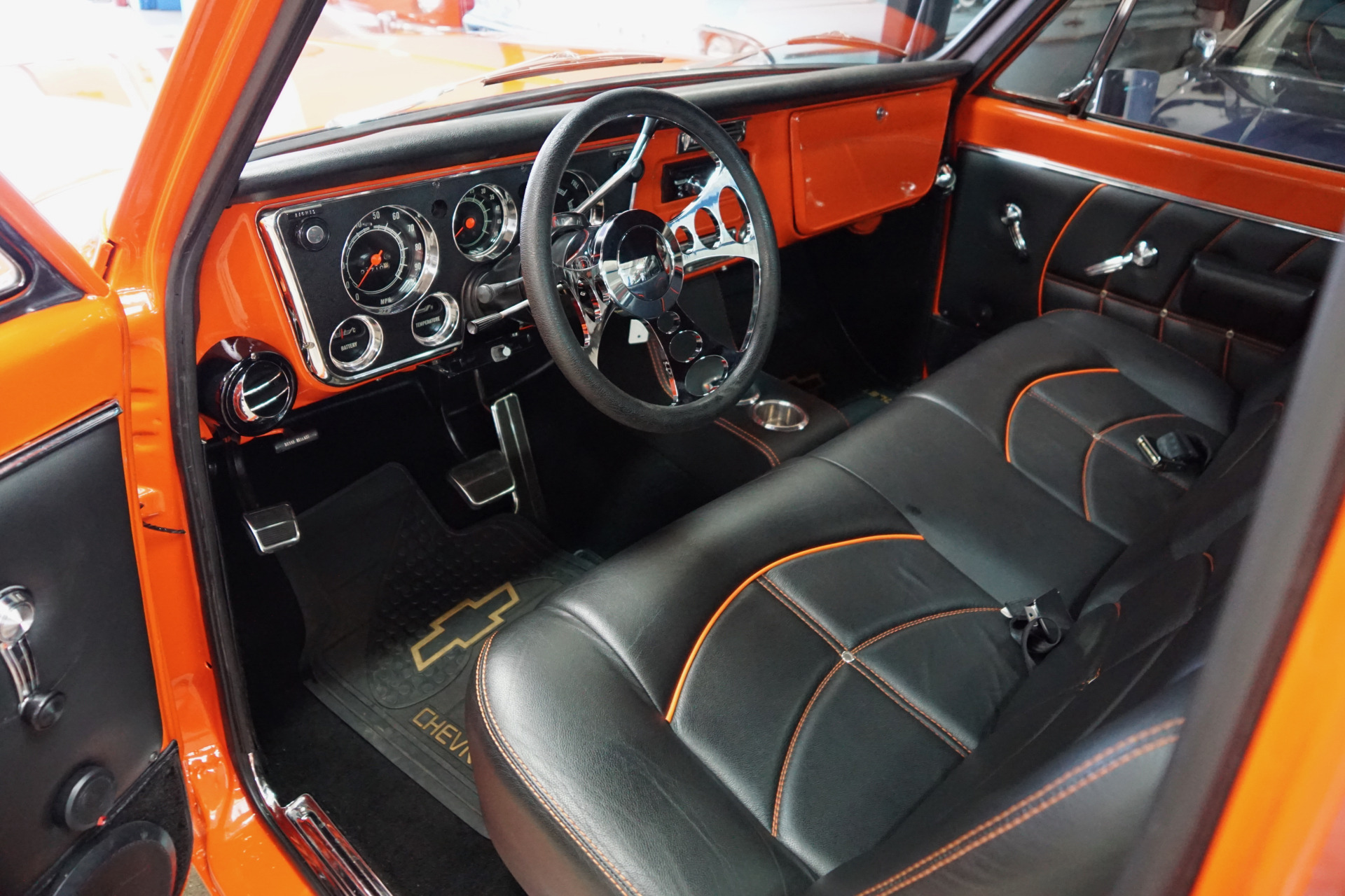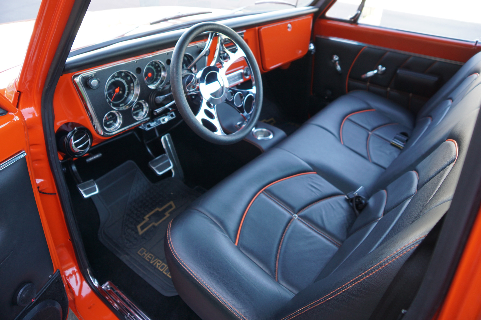 Finished in 'Hugger Orange' paint with a custom interior by renown and award winning 'Ron Mangus Custom Hot Rod Interiors'. Black leather with Orange Piping and custom cup holder. new headliner, carpet & seatbelts. Custom sound system with 1000 watt 'Rockford Fosgate' stereo system with 2 -10" woofers, tweeters & mids. Pioneer dash unit. Original gauge dash with custom steering wheel.