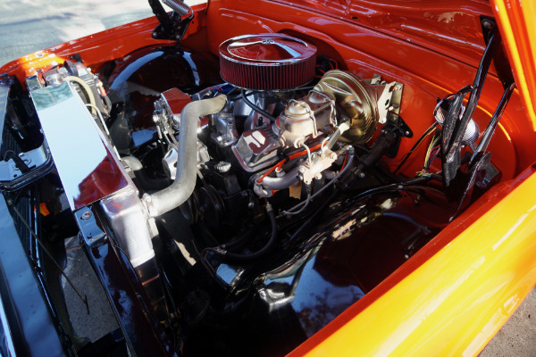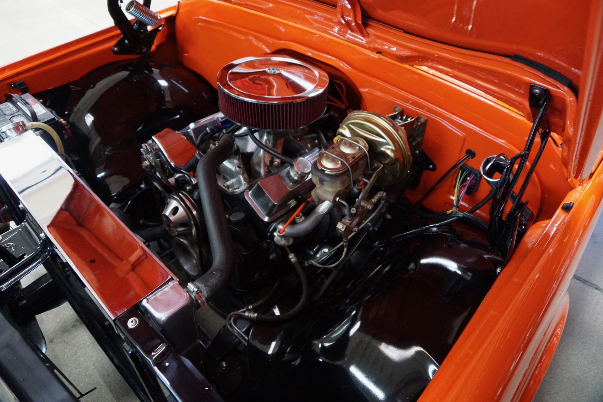 327 Chevrolet V8 with 4 Barrel Edelbrock carburetor with added electric pump, 350 automatic transmission, custom 2 fan radiator, all new wiring & battery. Gas tank removed & placed under the bed with custom gas funnel in rear bed with original gas cap in place for original look. New exhaust system, front disc brakes and rear drums.