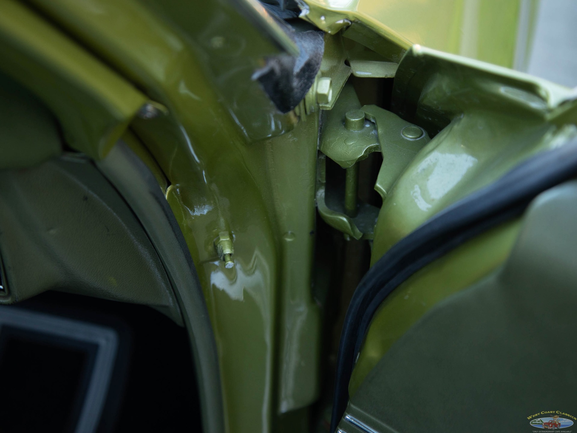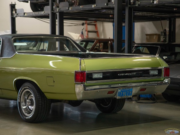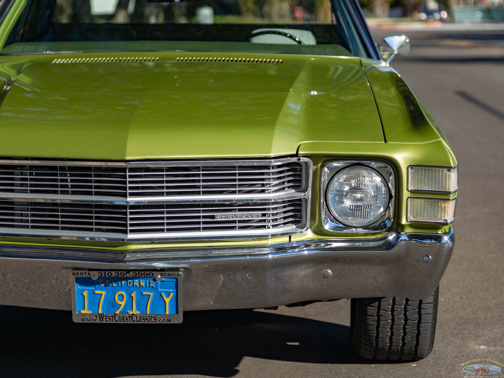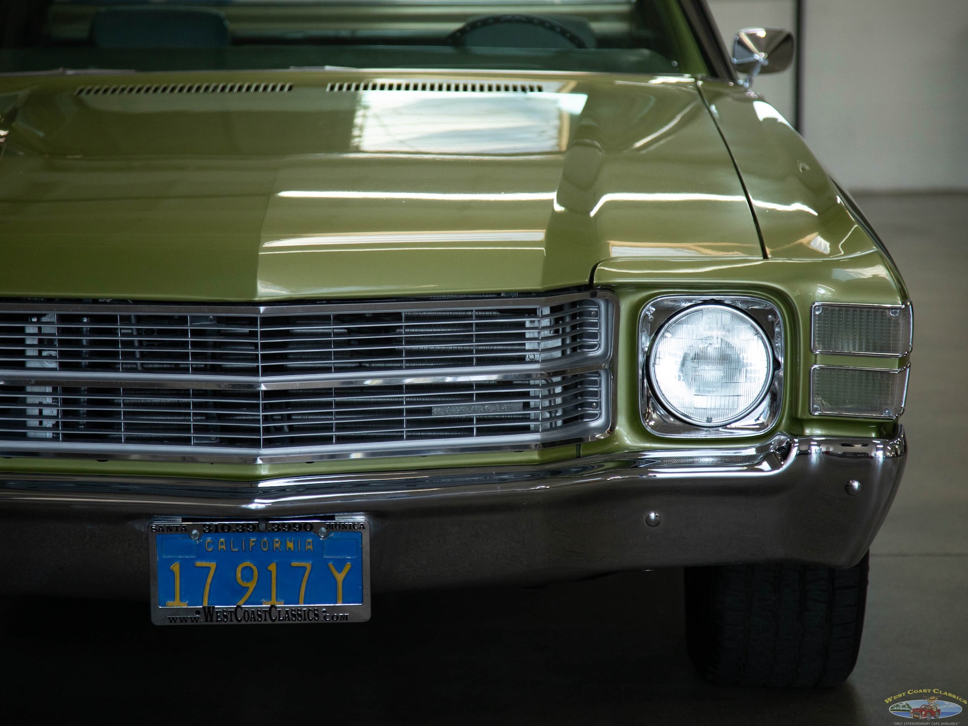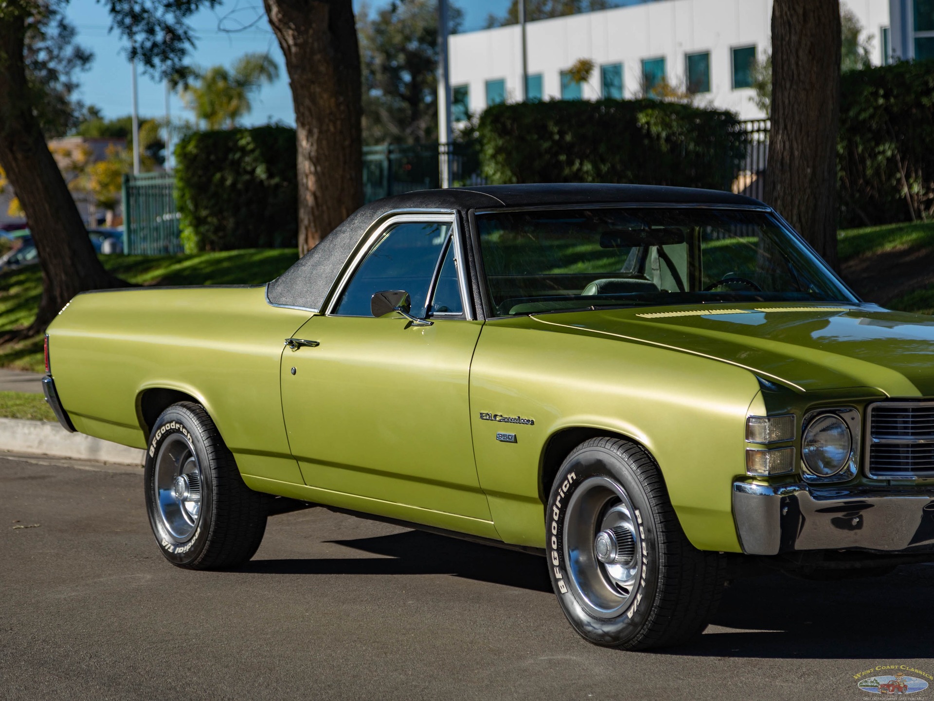 West Coast Classics are proud to present an absolutely exceptional example of this original southern California 1971 Chevrolet El Camino Pick Up in its original 'Cottonwood Green Metallic' factory color paint (42) with a Black Vinyl roof matched to its matching and striking all original 'Antique Dark Jade Elk Coated Fabric' (Trim 731) interior with its original 1970's Blue CA license plates and its 350 V8 engine and fully loaded with automatic transmission, air conditioning equipment, power steering, power brakes, fairly new tires, original AM radio, original spare wheel in cover behind the passengers seat with original jack, and matching Green color carpet and kick panel carpet and dashboard and door panels.