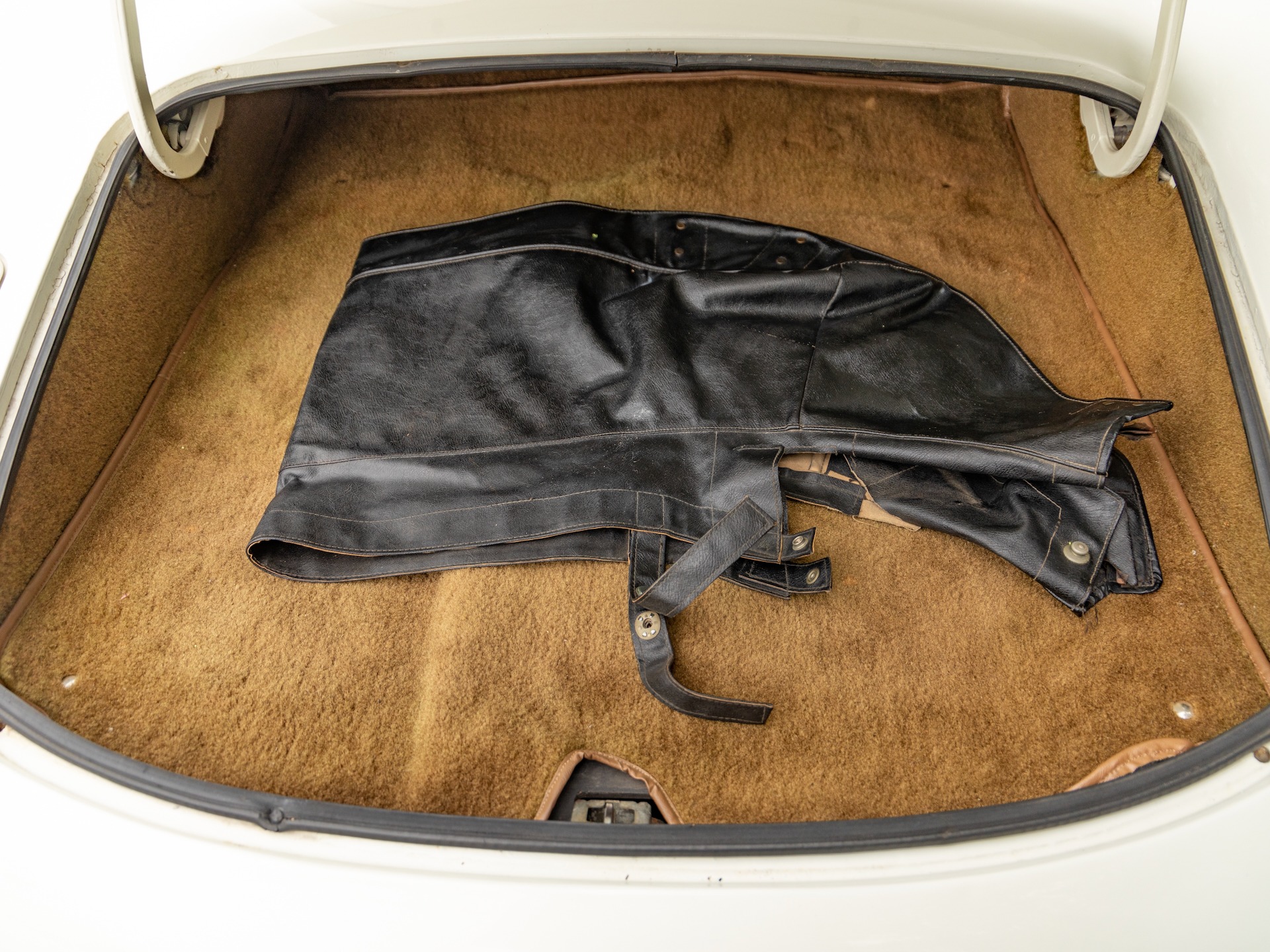 The floor boards and all the typical rust-prone areas are completely solid and rust-free! The car has no signs of any accidents of any kind with a very straight body with absolutely no rust. This striking 'Old English White' older color paint is in very good condition and the car looks extremely impressive with a lovely all original 'Black' leather interior which is also in complete and mostly all original condition, showing only very minor signs of patina. The original door panels, headliner, dashboard and carpets are all in very fine condition also. The chrome is all very good and straight with only extremely minor and quite acceptable pitting for its age. The car has it's original chrome wire wheels and it's original chrome spare wire wheel in the trunk compartment.
