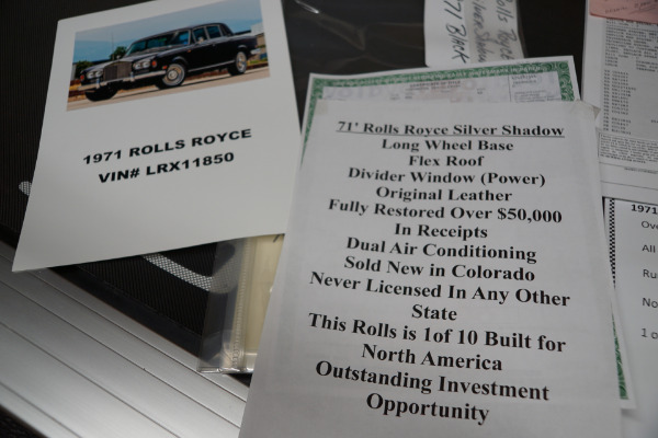 West Coast Classics are proud to present a supremely striking and obviously exceptionally well maintained and extraordinarily rare, reportedly only 1 of 10 factory Long Wheel Base models built for North America and even fewer with the electric glass divider with dual air conditioning, and a superbly collectible example with over $50K in recent receipts from the Ferrari dealership of Denver, CO, of this 1971 factory US LWB 'small chrome bumper' Rolls Royce Silver Shadow/Silver Wraith models. Sold new in Colorado and obviously always garaged and meticulously kept with believed to be only 24K original miles and finished in the simply stunning 'glass like' and flawless beautiful original 'Mason's Black' color paint with it's all original 'Beige' color 'Connolly' leather hides interior and with color matching Rolls Royce hubcaps!