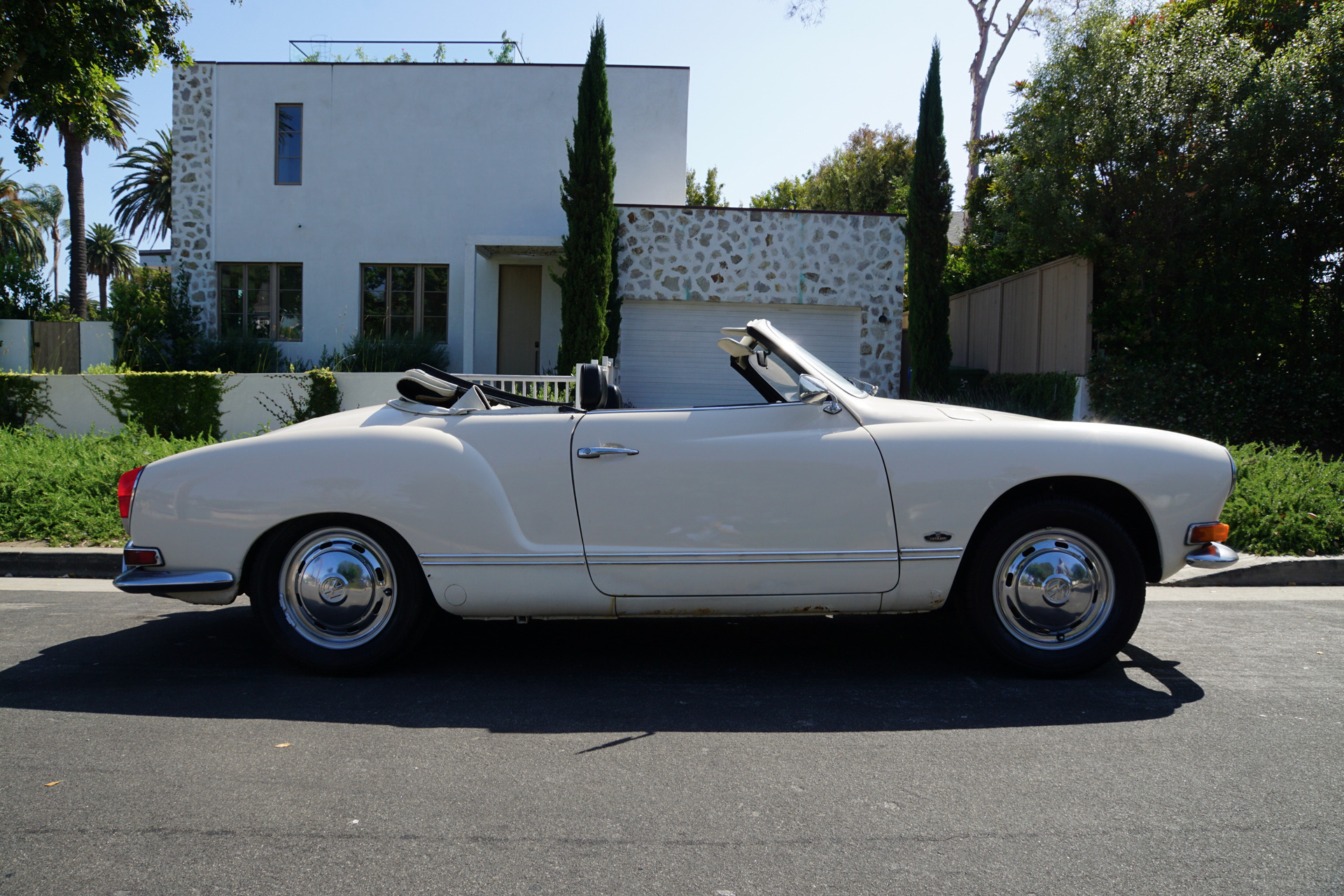 In 1957, the VW Karmann coachwork Osnabruck's assembly line built 105 Karmann Ghia Convertibles which was a landmark design of it's day in ragtop simplicity compared to contemporary British roadsters! VW advertising made much about Karmann's almost hand construction methods, which included filling, filing and sanding all seams before painting. A delicate blend of old-world German craftmanship and Italian soul, this car proved that sports cars were as much about style and grace as they were about performance and almost twenty years later on 7/31/1974, when VW halted production, it had proved to be one of the all-time best selling and most loved sports cars in the world.