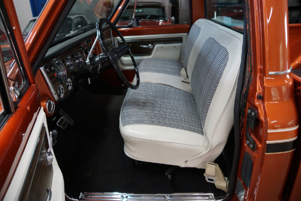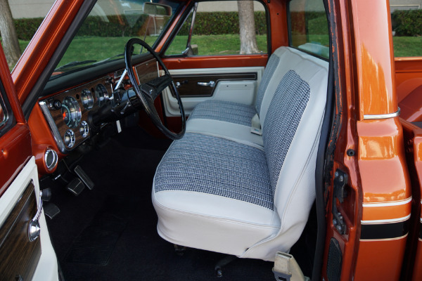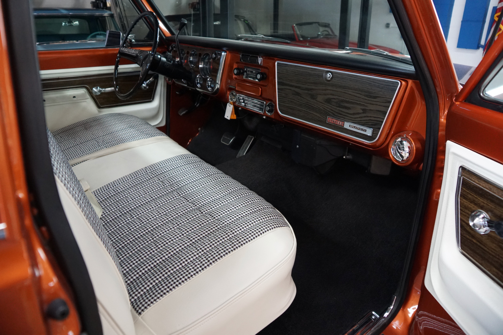Finished in two-tone 'Bronze and Black' color paint with accent striping and with the 350 V8 engine and which is loaded with rare options including: air conditioning equipment, power steering, power front disc brakes, tilt steering column, Rally wheels with new tires, 'Cheyenne Super' interior and trim with a striking and upgraded 'Houndstooth Black & White' seats interior with matching black color carpet and kick panel carpet and dashboard and door trim panels, gauges, tachometer & locking hubs.