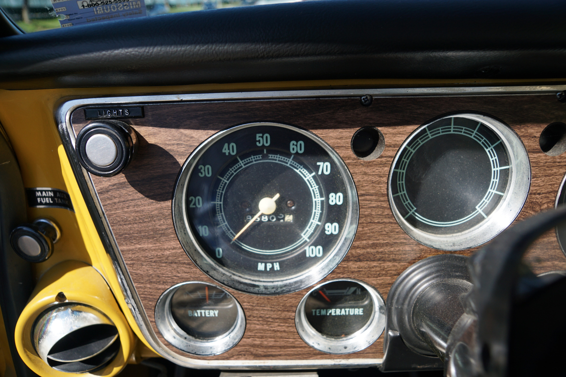 The truck was optioned with the heavy-duty rear springs and shocks, which raised the GVW from 6,400 to 7,500 pounds; with the 8.75-16.5 load range D tires, it earned the right to carry the 'Custom Camper' badge. You could order the springs, tires, or shocks a-la-carte and not have the badge. To get the badge, though, you had to have all the required equipment. The top-dog in the Trim Packages for 1972 was the 'Sierra Grande' package which offered an extra look of richness with woodgrain inserts in the door panels, glove box and instrument cluster, and nylon houndstooth inserts in the seats with co-ordinated vinyl trim and carpeting, extra floor and top cowl insulation is included as well as Bright Metal interior and exterior trim. Air conditioning was a $400 option.