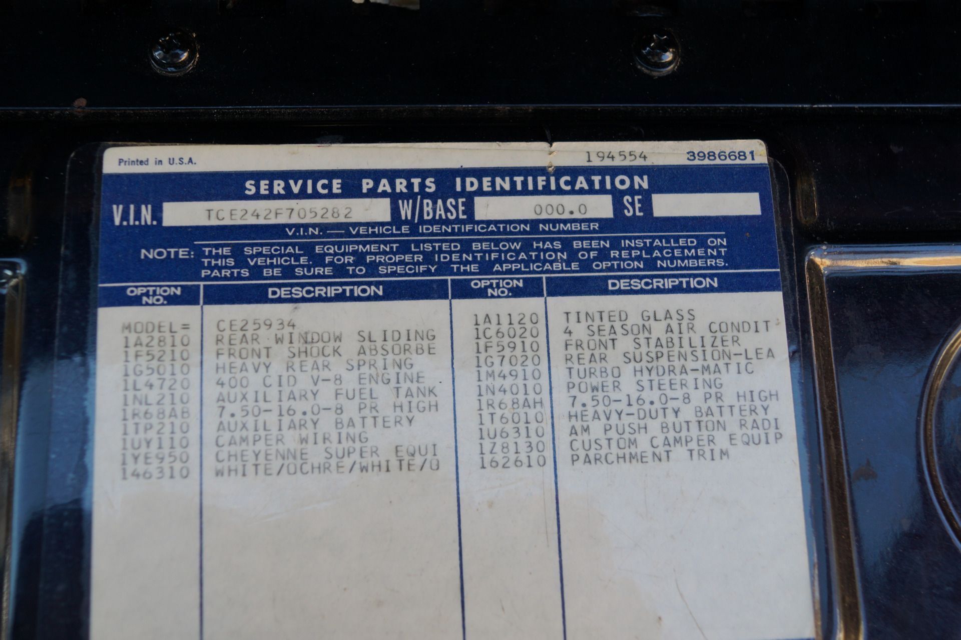 Finished in its original 'White over Ochre over White' Tri-color factory color paint with its original matching # 'TKX' Suffix Code 402 4V 240HP V8 engine with 85K reportedly original miles and with air conditioning equipment, power steering, power brakes, fairly new tires, 'Black & White Houndstooth' bench custom seat interior and trim with matching black color carpet and kick panel carpet and dashboard and door trim panels and boasting the original factory 'Sierra Grande' and 'Custom Camper' packages.