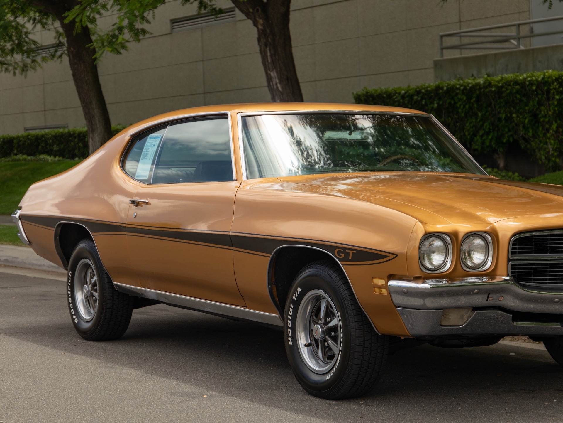 The "Le Mans GT" first known as a GT-37 option package in 1971 was a marketing ploy by Pontiac to make an affordable muscle car for everyone. In Fact the marketing slogan was There's a little GTO in every GT-37-and you don't have to be over 30 to afford one. In fact if you got the stripped down GT-37 with a 455 under the hood it was in fact, a GTO Killer. This didn't sit well with GTO owners and led to the T-37's quick disappearance. The car became known simply as the GT for 1972 and could be ordered with any engine option as well. It also included white letter tires, body colored mirrors, rally stripes, dual exhaust and GT decal identification.