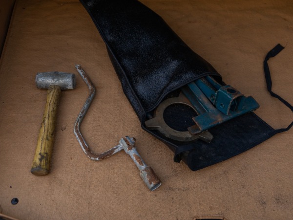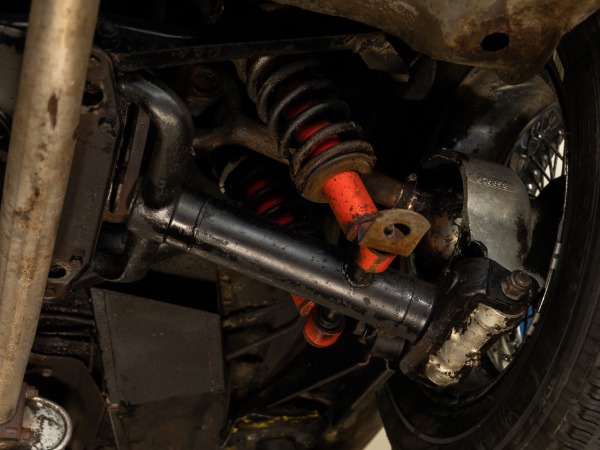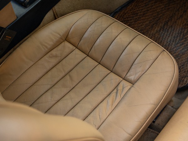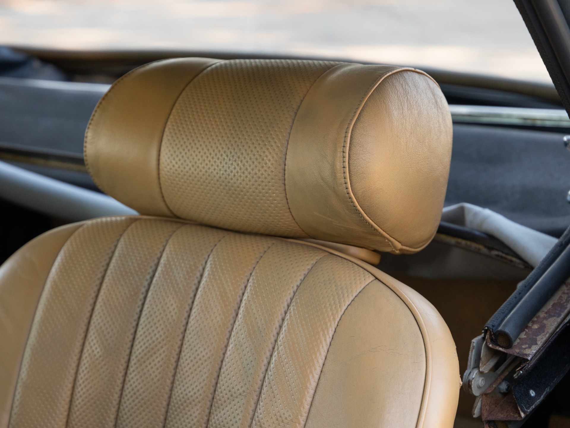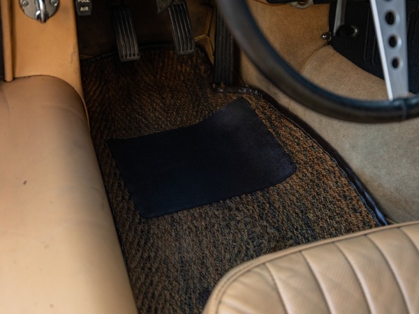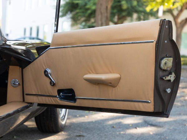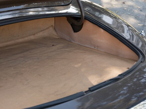 The car has no rust whatsoever with the floor boards and all the typical rust-prone areas completely original, solid and rust-free! The car has had no major accidents of any kind and has a razor straight body. The car looks extremely impressive in it's original color paint and the car still boasts it's original Tan color leather interior with the door panels, dashboard, seats and carpets all in very fine condition. The original Black color soft top is in great shape and the car has it's original matching tonneau cover and very rare and desirable factory hard top. The factory chrome wire wheels are also in beautiful condition and the car has it's original spare wire wheel located in the trunk which of note has its all original wood trunk lining and the spare wheel compartment is all in remarkably intact and all original unspoilt condition.
