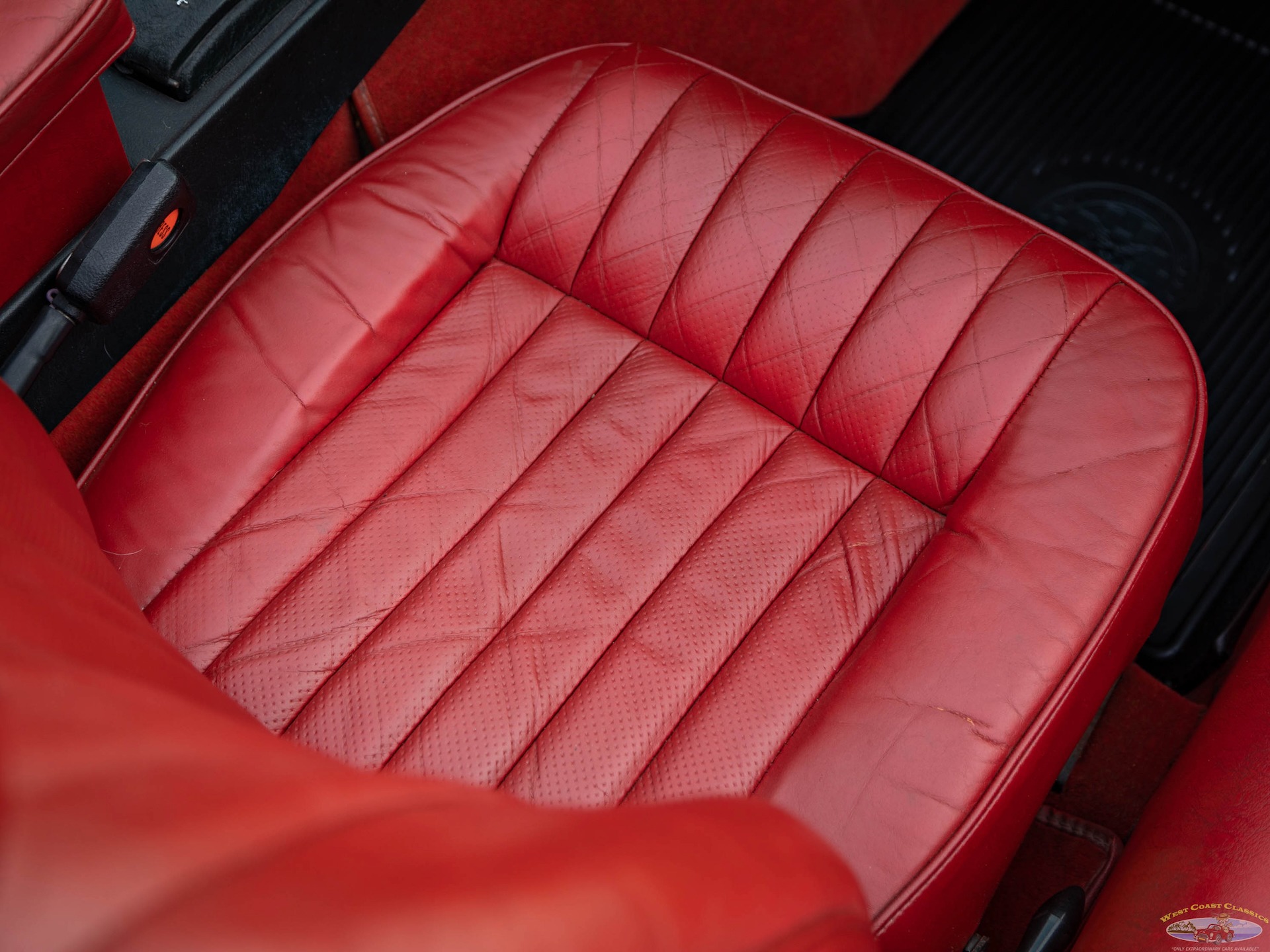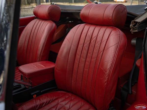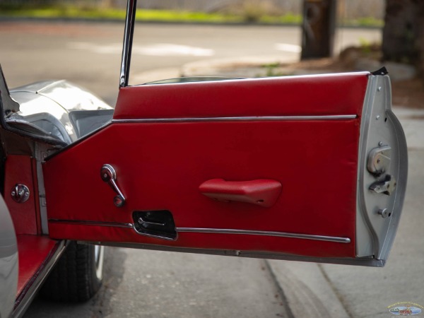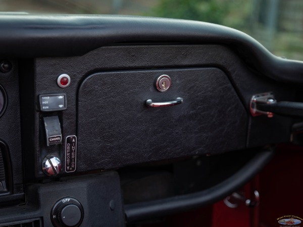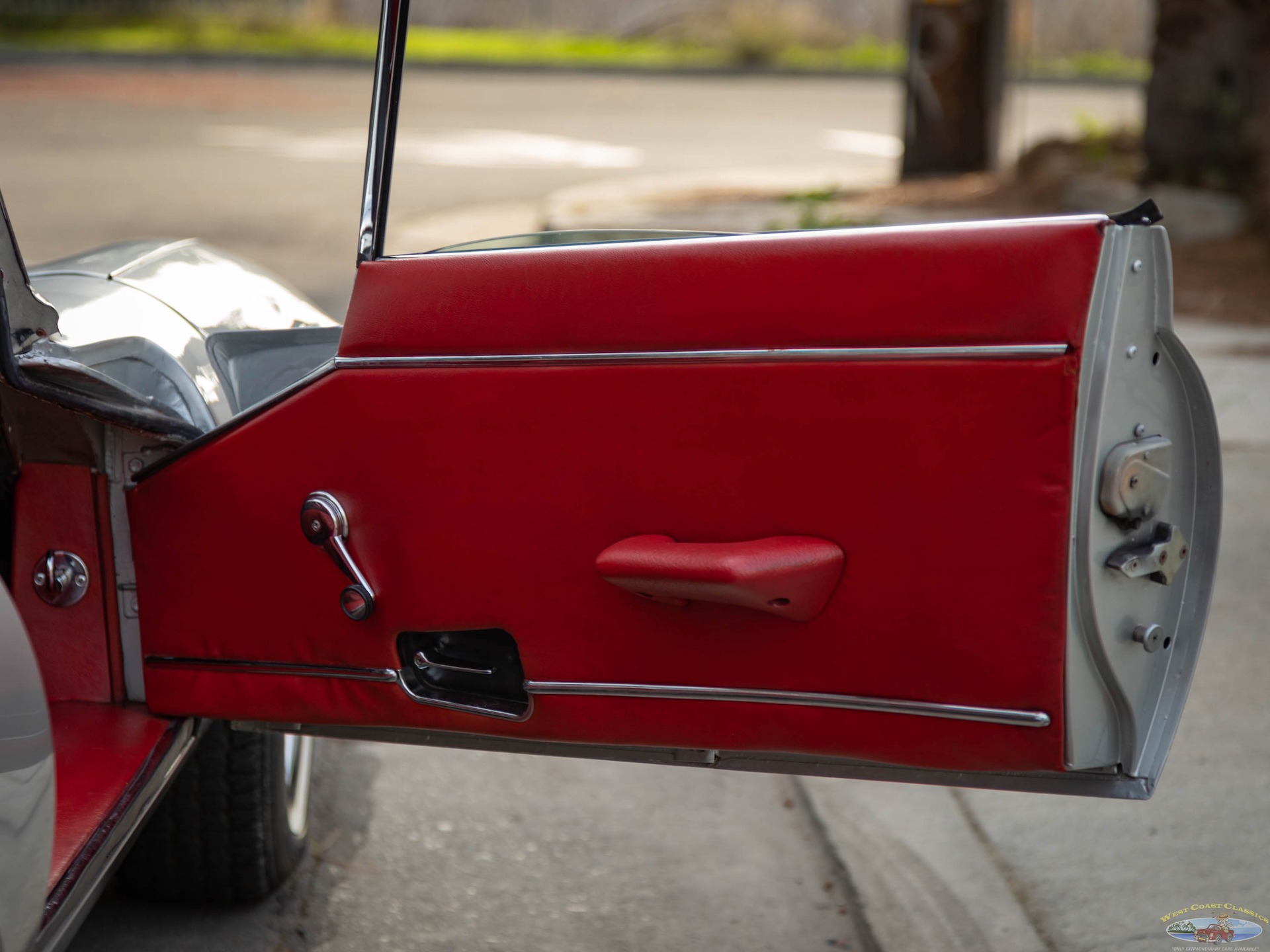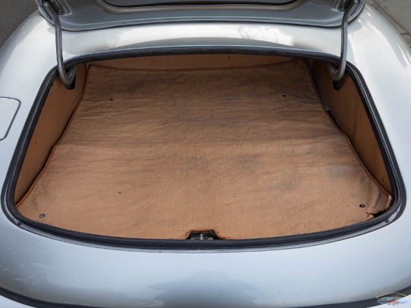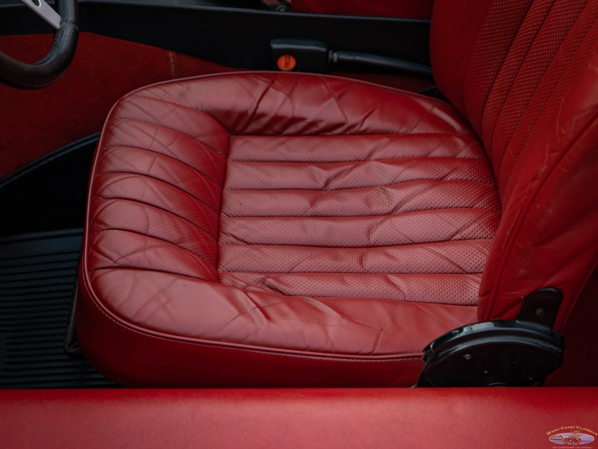 The car has no rust whatsoever with the floor boards and all the typical rust-prone areas completely original, solid and rust-free! The car has no signs of any accidents of any kind and has a razor straight body. The car looks extremely impressive in it's original color paint and the car still boasts it's original Red color leather interior with the door panels, dashboard, seats and carpets all in very fine condition. The original soft top is in great shape and the factory chrome wire wheels are also in beautiful condition and the car has it's original spare wire wheel located in the trunk which of note has its all original wood trunk lining and the spare wheel compartment is all in remarkably intact and all original unspoilt condition.