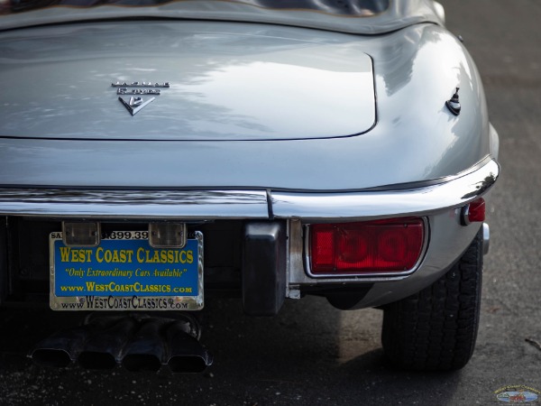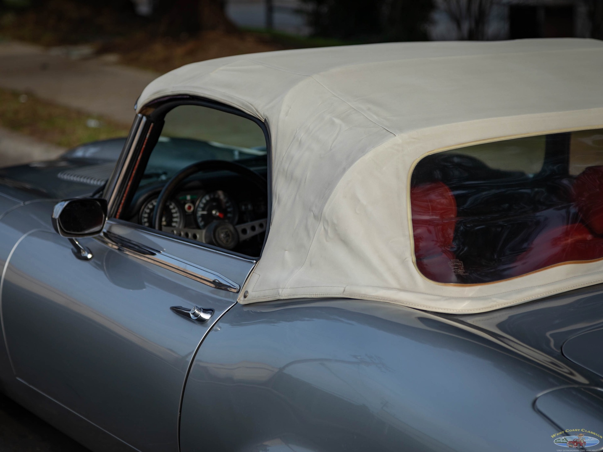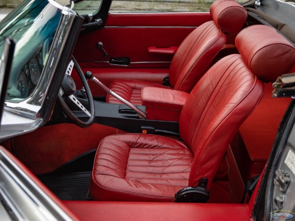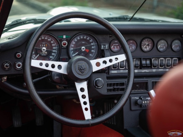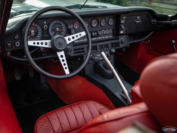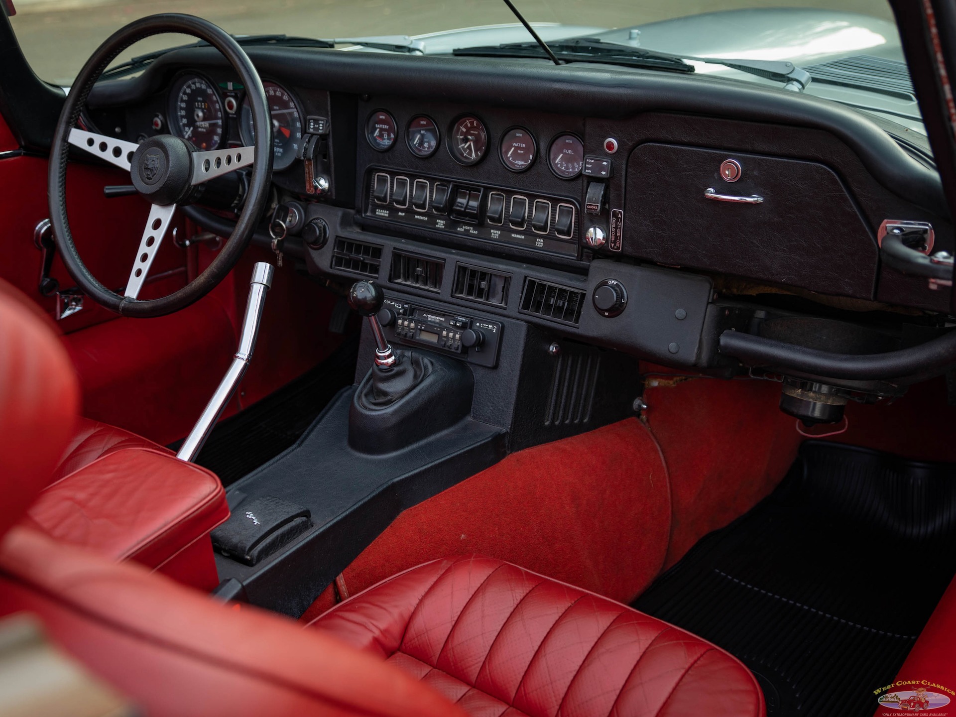A completely rust free example of this coveted penultimate year of the legendary E-Type Jaguar, still boasting the very desirable factory small chrome bumpers, before the ugly 1974 big rubbers, and with its original matching #'s V12 engine, its original and very desirable 4 speed manual transmission and with all of it's original factory specifications and options including original Red leather interior, AM radio, power steering and air conditioning!