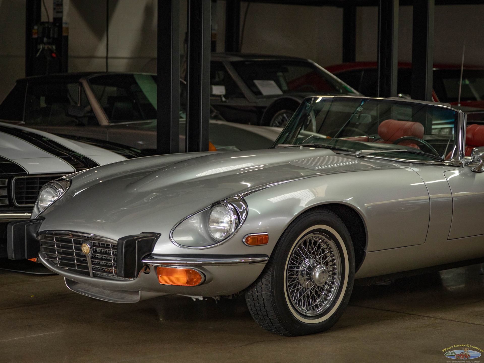 West Coast Classics are proud to present an absolutely exceptional and very rare barn-fresh (garage really!) find of a virtually completely original in its original striking 'Silver' factory paint and with its all original classic 'Red' leather interior 1973 Jaguar XKE E-Type V12 Series III Roadster with original folding soft top, air conditioning, power steering, AM radio, and reportedly boasting low original miles !