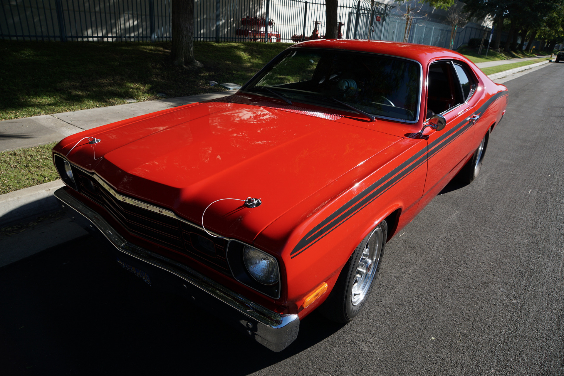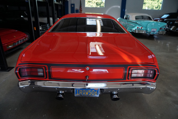 West Coast Classics are proud to present an absolutely exceptional and beautiful example of this wonderfully, and with no expense spared whatsoever, customized race ready 1973 Plymouth Valiant Duster which received a full frame off restoration and customization by its previous owner with a Mopar Magnum 5.9L 360/390HP V8 performance crate motor and is finished in a striking custom 'Red' color with factory period Black '360' racing stripes and graphics and a custom grey velour bucket seat interior with black carpeting. Ready to show or race.