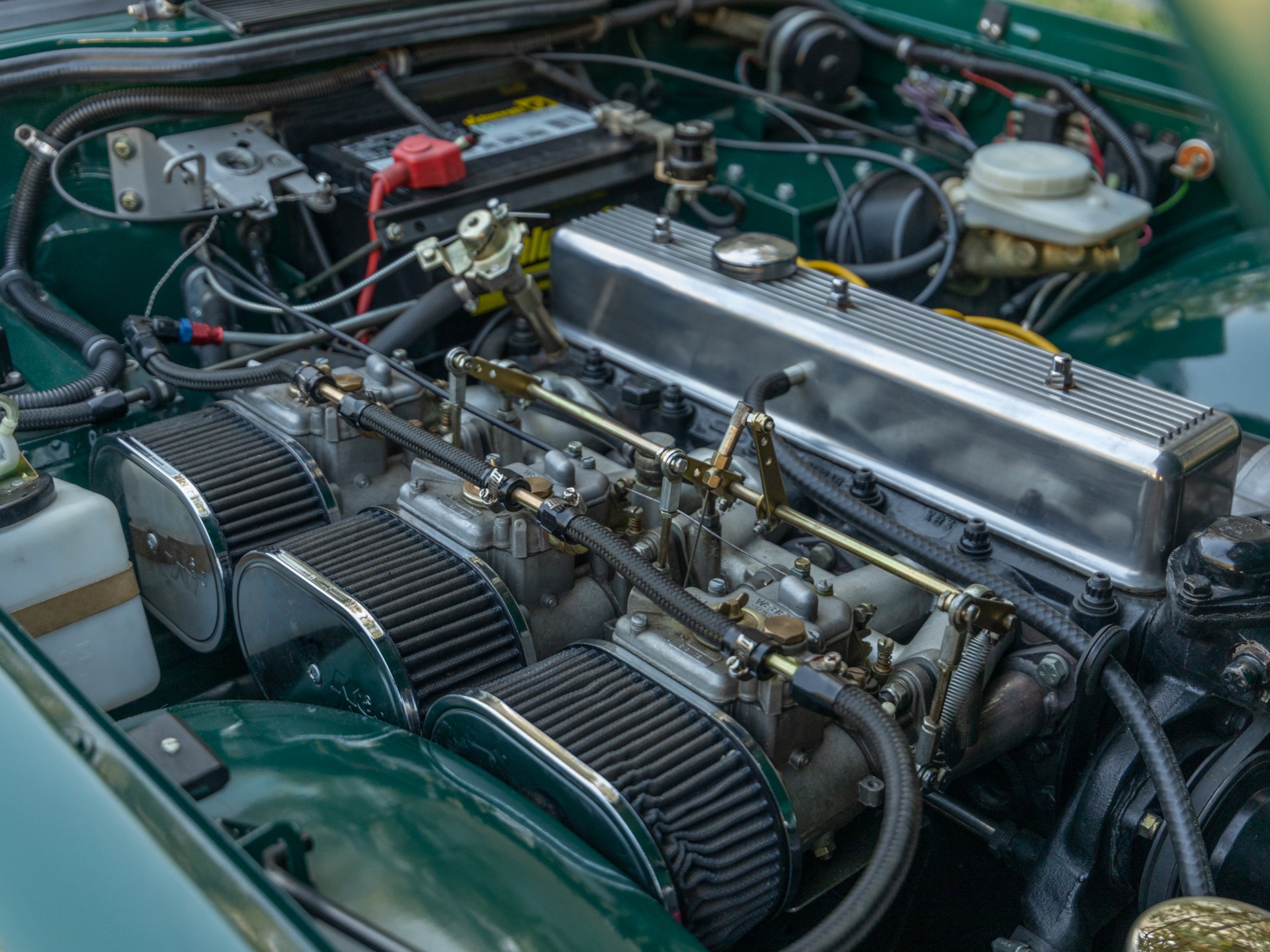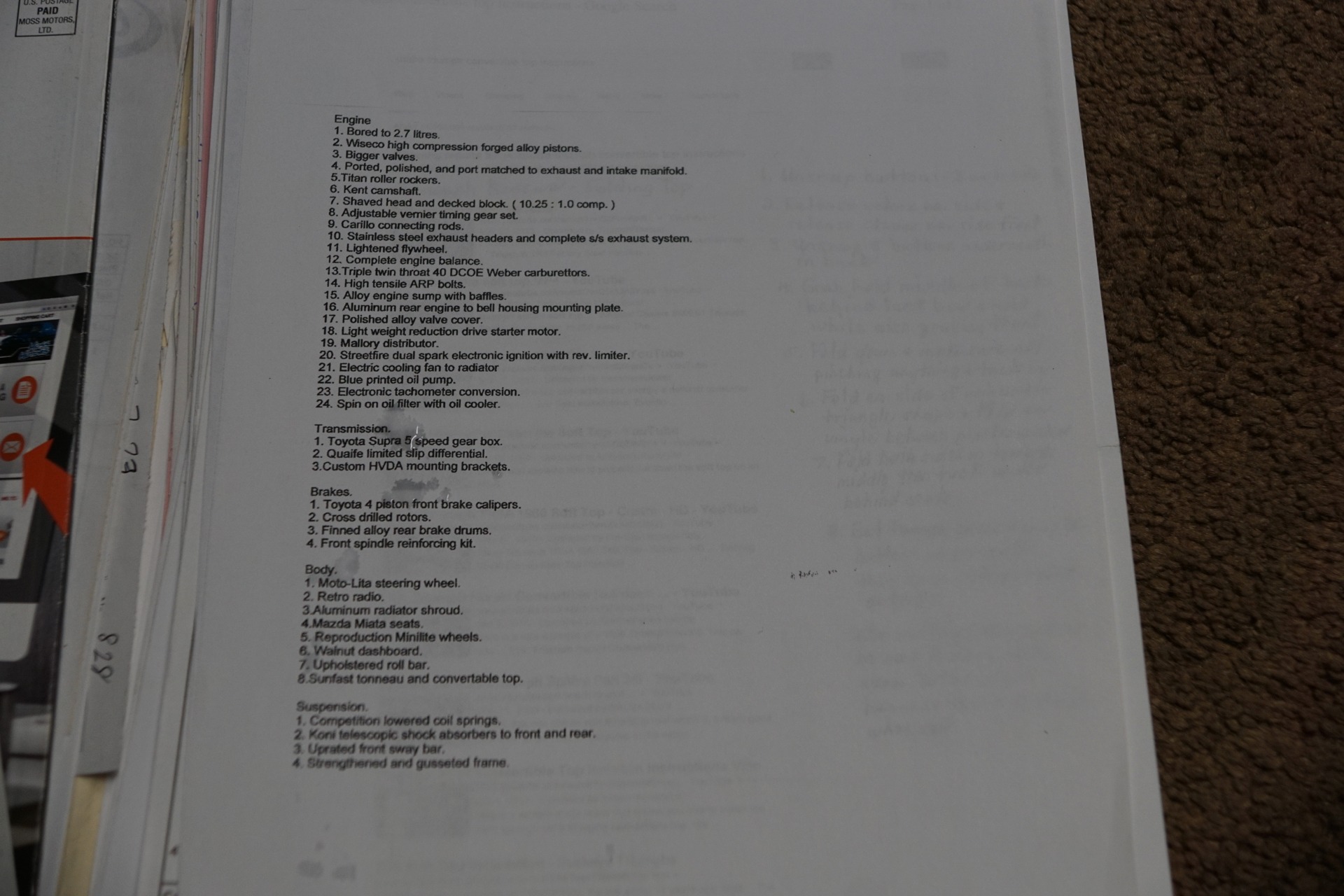 The engine has been bored to 2.7 litres and upgrades include; Wiseco high compression forged alloy pistons, bigger valves, ported, polished, and port matched to exhaust & intake manifold, Titan roller rockers, Kent camshaft, shaved head & decked block (10.25:1.0 comp), adjustable vernier timing gear, Carillo connecting rods, stainless steel exhaust headers & complete stainless steel exhaust system, lightened flywheel, complete engine balance, Triple twin throat 40 DCOE Weber carburetors, high tensile ARP bolts, alloy engine sump with baffles, aluminum rear engine to bell housing mounting plates, polished alloy valve cover, light weight reduction drive starter motor, Mallory distributor, Streetfire dual spark electronic ignition with rev counter, electric cooling fan to radiator, Blue printed oil pump, Electronic tachometer conversion, spin on oil with oil cooler, Toyota Supra 5 speed gear box, Quaife limited slip differential, custom HVDA mounting brackets, Toyota 4 piston front brake calipers, cross drilled rotors, finned alloy rear brake drums, front spindle reinforcing kit, Moto Lita steering wheel, retro radio, aluminum radiator shroud, Mazda Miata seats, reproduction Minilite wheels, walnut dashboard, upholstered roll bar, Sunfast tonneau and convertible top, competition lowered coil springs, Koni telescopic shock absorbers, front & rear, uprated front sway bar, strengthened & gusseted frame.