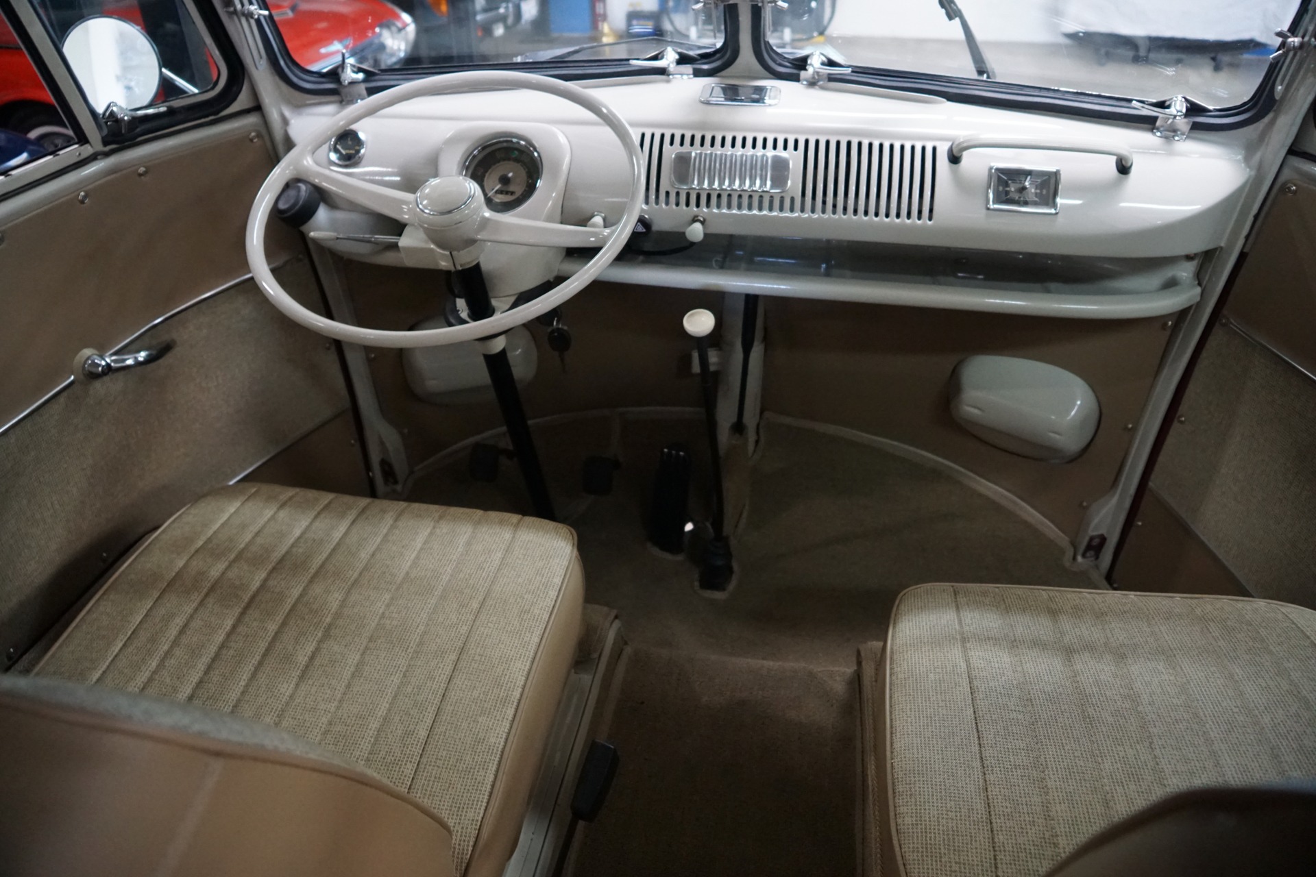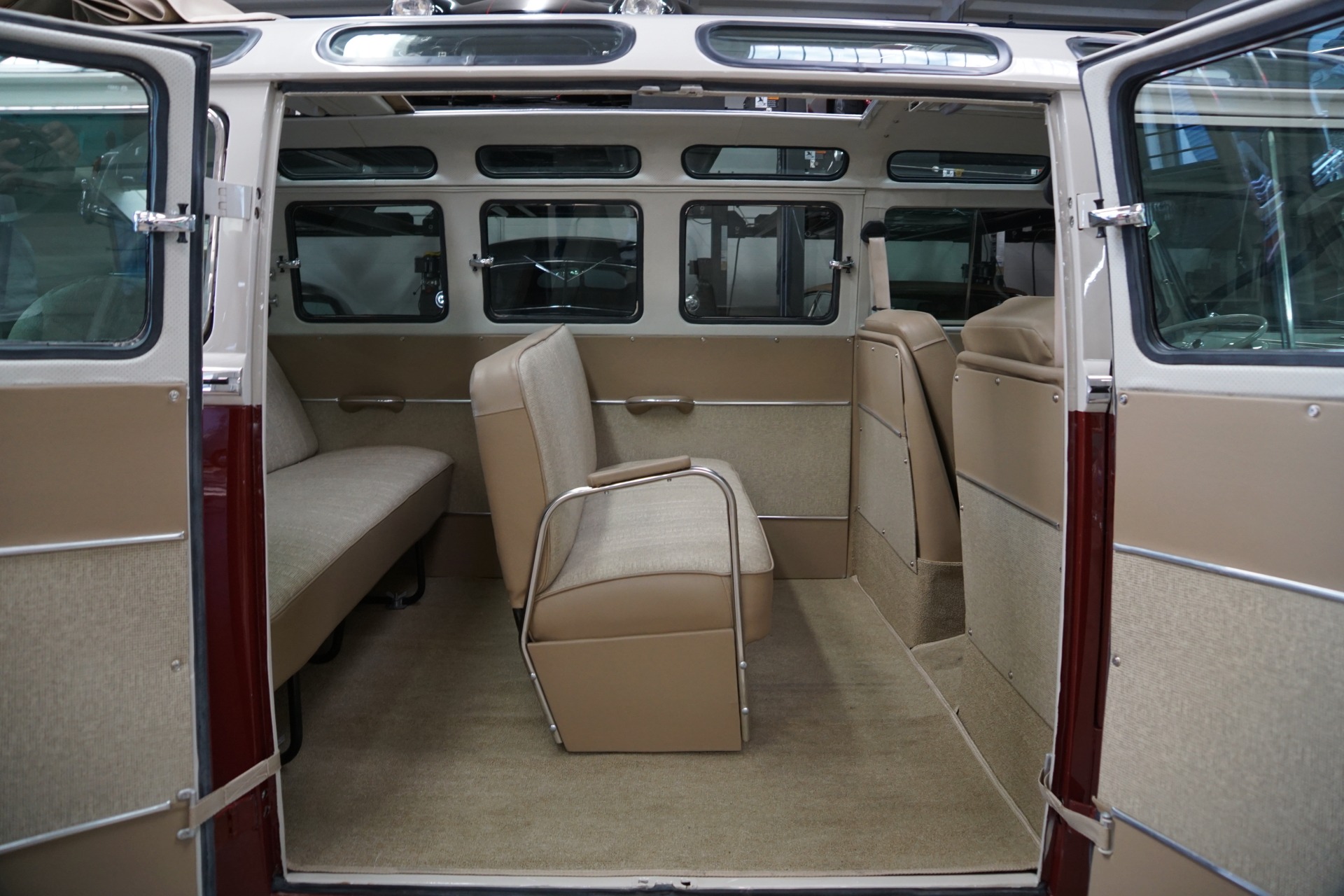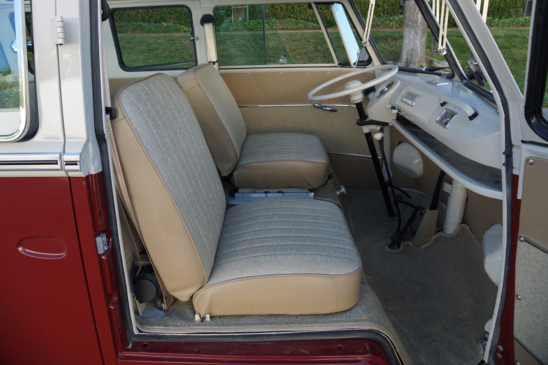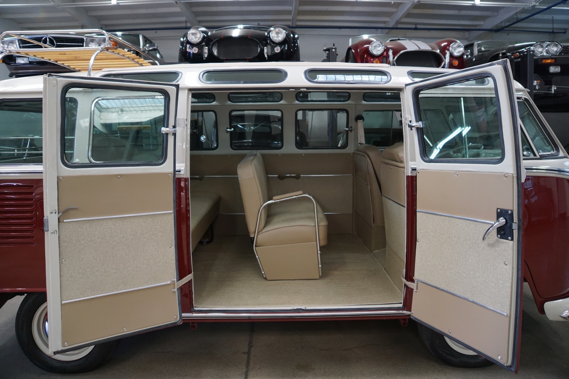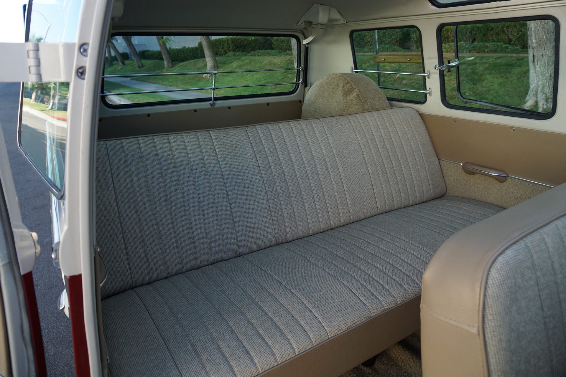 The body is razor straight and all the door and panel fits are original and as they should be and the bus is fitted with highly desirable 'original German' Safari front windows. The original 1500 single carb 4 cylinder engine was completely rebuilt and is matched to a 4 speed manual transaxle. During the restoration, the complete drivetrain was refurbished, including the engine, gearbox, differential and reduction boxes as well as a new carburetor was installed along with a vacuum advanced electronic ignition distributor, ignition coil, spark plugs and wires. The suspension, steering and braking systems were also refurbished with new parts as well as the 12-volt electrical system. Finished in the classic two-tone theme of 'Pearl White' top and 'Titan Red' bottom exterior it features eight chrome framed panoramic samba windows, a retractable ragtop canvas sunroof, a split windshield with safari windows, a wider trunk lid and a roof rack and ladder that combines stainless steel and wood.