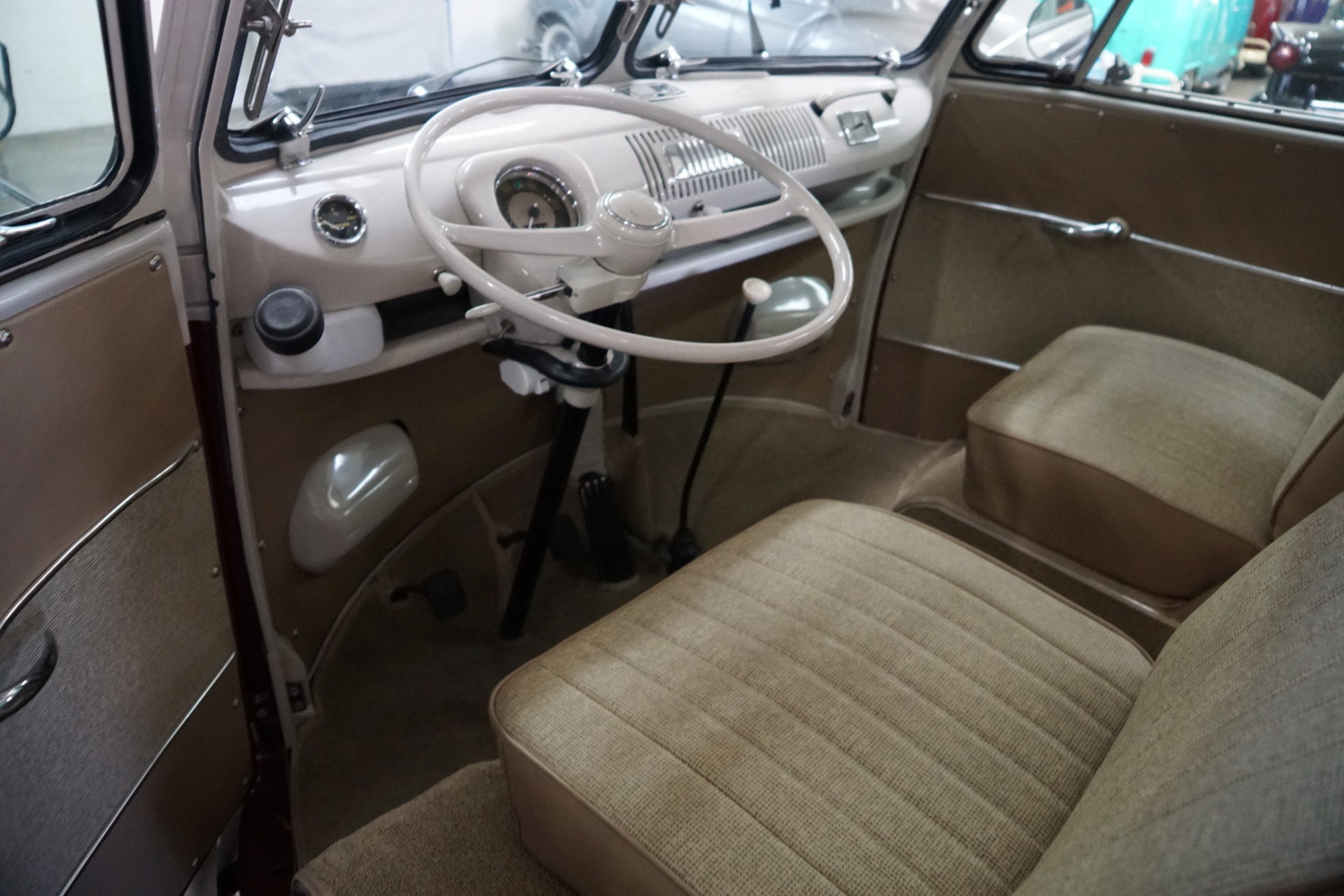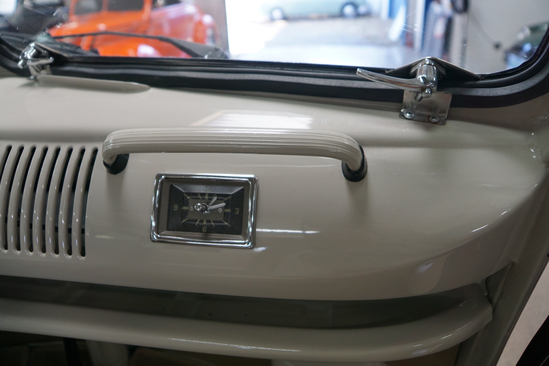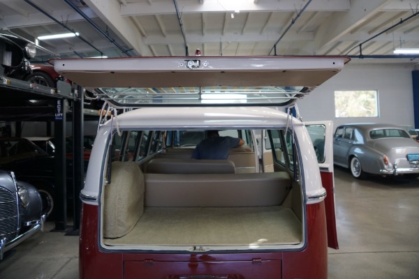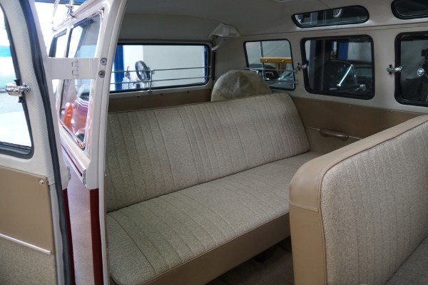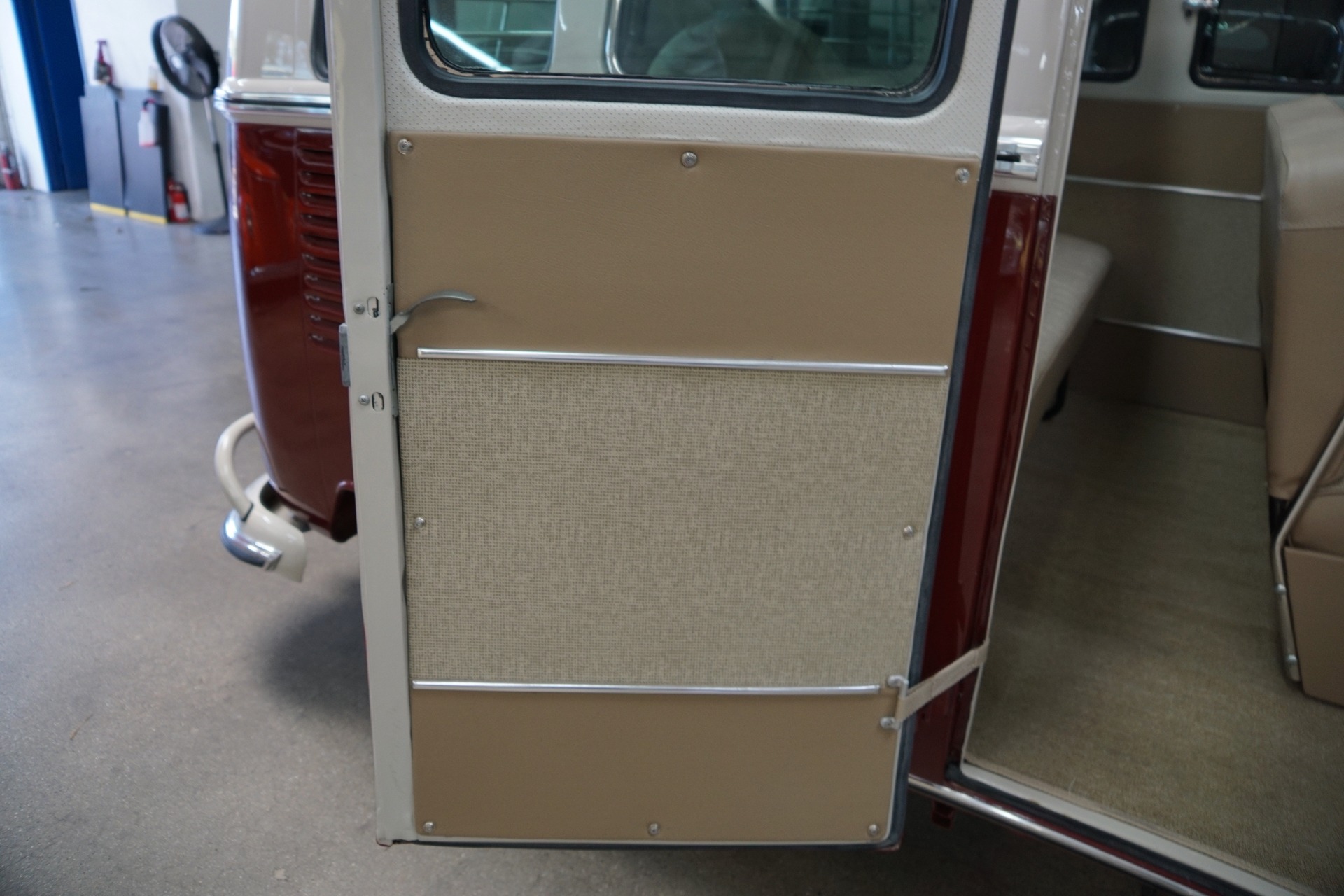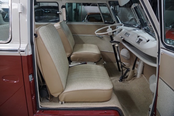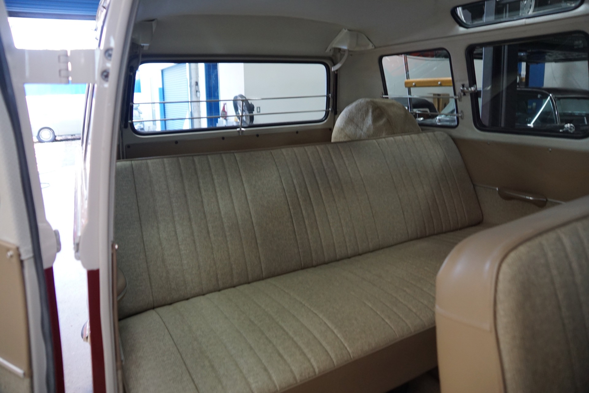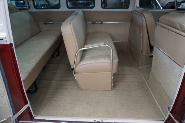 The body is razor straight and all the door and panel fits are original and as they should be and the bus is fitted with highly desirable 'original German' Safari front windows. The original 1500 single carb 4 cylinder engine was completely rebuilt and is matched to a 4 speed manual transaxle. During the restoration, the complete drivetrain was refurbished, including the engine, gearbox, differential and reduction boxes as well as a new carburetor was installed along with a vacuum advanced electronic ignition distributor, ignition coil, spark plugs and wires. The suspension, steering and braking systems were also refurbished with new parts as well as the 12-volt electrical system. Finished in the classic two-tone theme of 'Pearl White' top and 'Titan Red' bottom exterior it features eight chrome framed panoramic samba windows, a retractable ragtop canvas sunroof, a split windshield with safari windows, a wider trunk lid and a roof rack and ladder that combines stainless steel and wood.