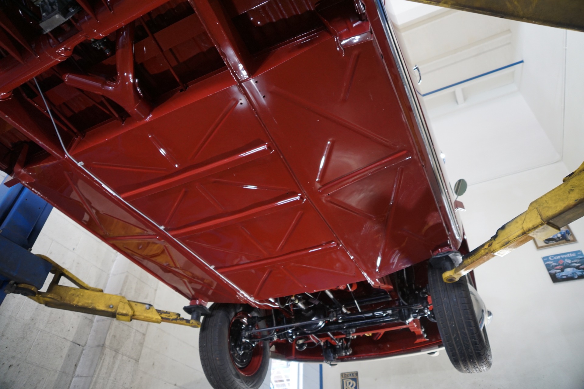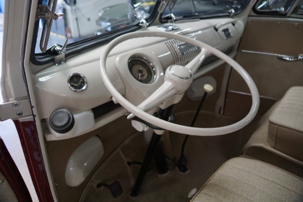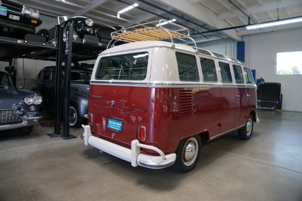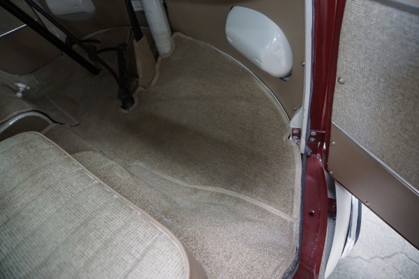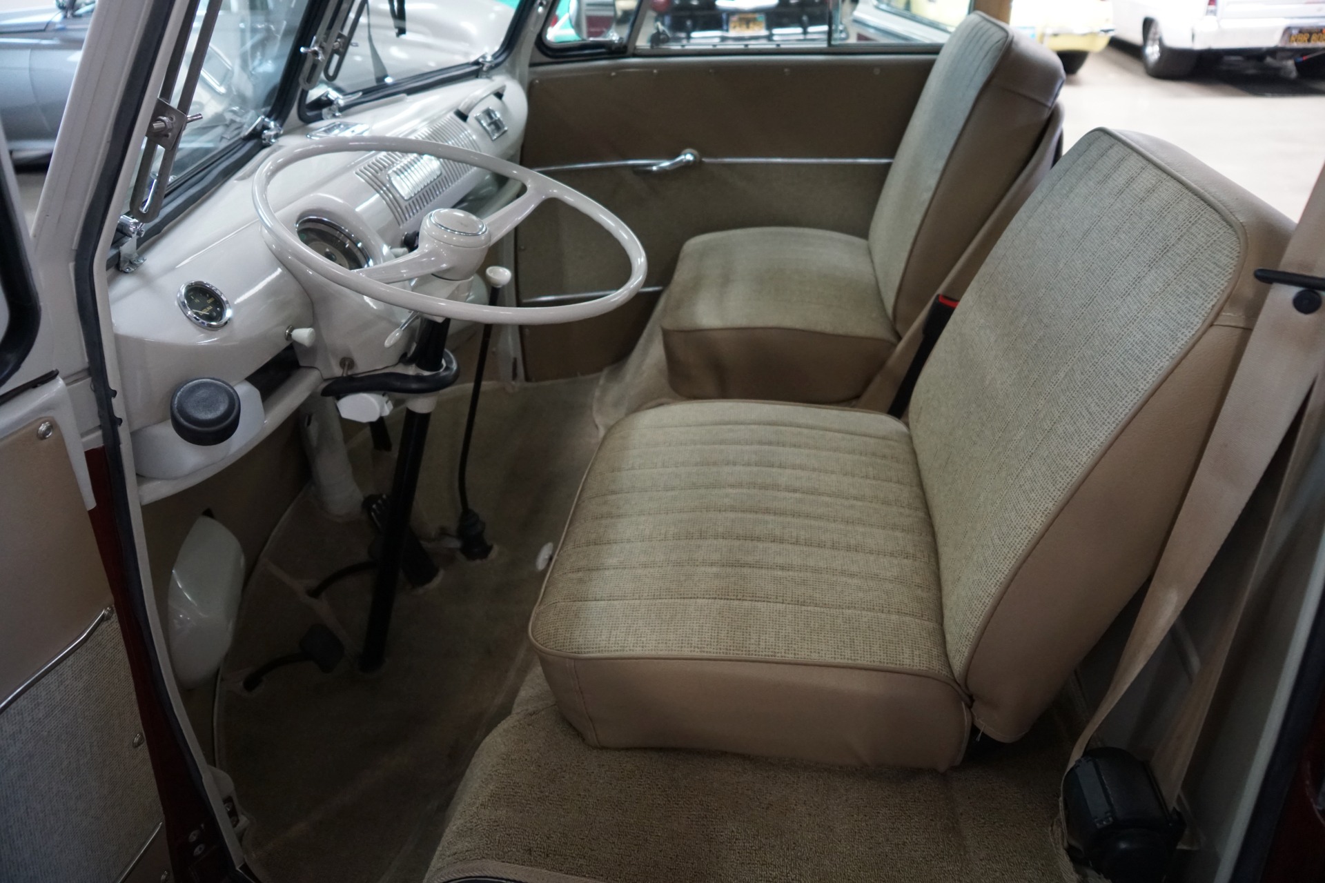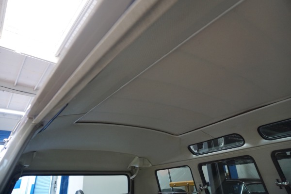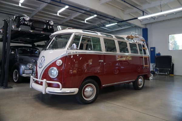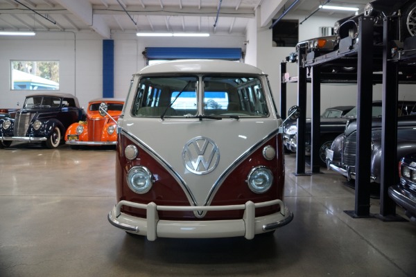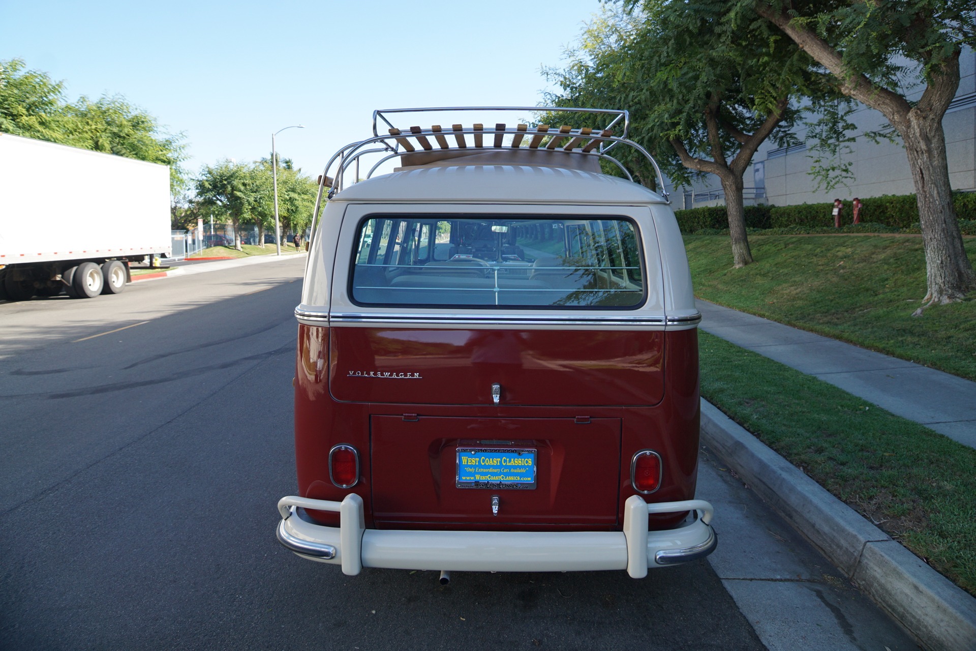 The body is razor straight and all the door and panel fits are original and as they should be and the bus is fitted with highly desirable 'original German' Safari front windows. The original 1500 single carb 4 cylinder engine was completely rebuilt and is matched to a 4 speed manual transaxle. During the restoration, the complete drivetrain was refurbished, including the engine, gearbox, differential and reduction boxes as well as a new carburetor was installed along with a vacuum advanced electronic ignition distributor, ignition coil, spark plugs and wires. The suspension, steering and braking systems were also refurbished with new parts as well as the 12-volt electrical system. Finished in the classic two-tone theme of 'Pearl White' top and 'Titan Red' bottom exterior it features eight chrome framed panoramic samba windows, a retractable ragtop canvas sunroof, a split windshield with safari windows, a wider trunk lid and a roof rack and ladder that combines stainless steel and wood.