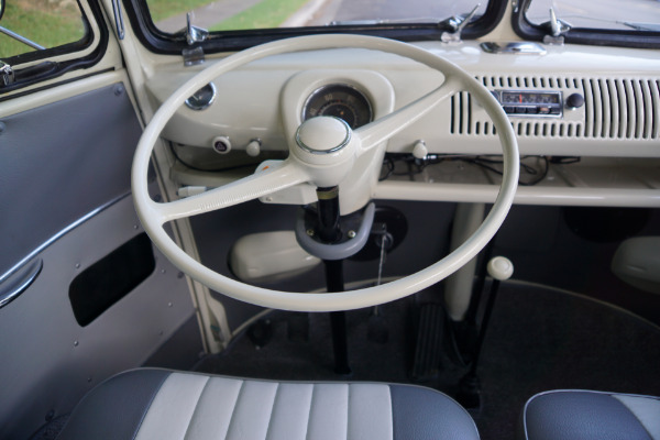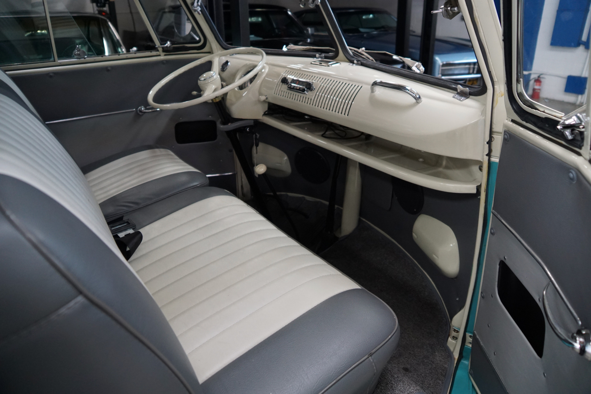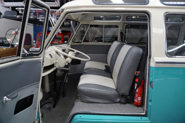 The body is razor straight and all the door and panel fits are original and as they should be and the bus is fitted with highly desirable 'original German' Safari front windows. The bus was finished in a very professional and a gorgeous two-tone color combination of blue and white paint and the bus has an absolutely beautiful all new Gray & White interior and a carpeted rear deck!