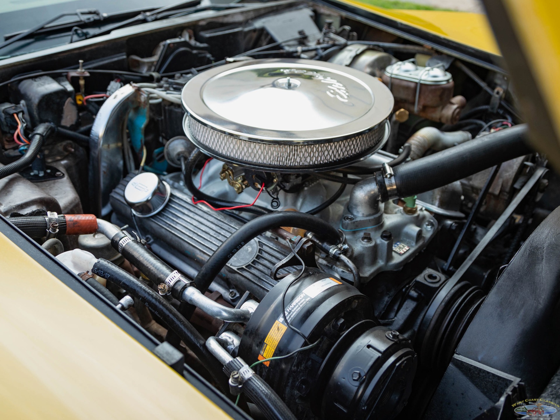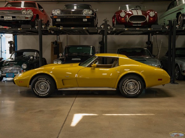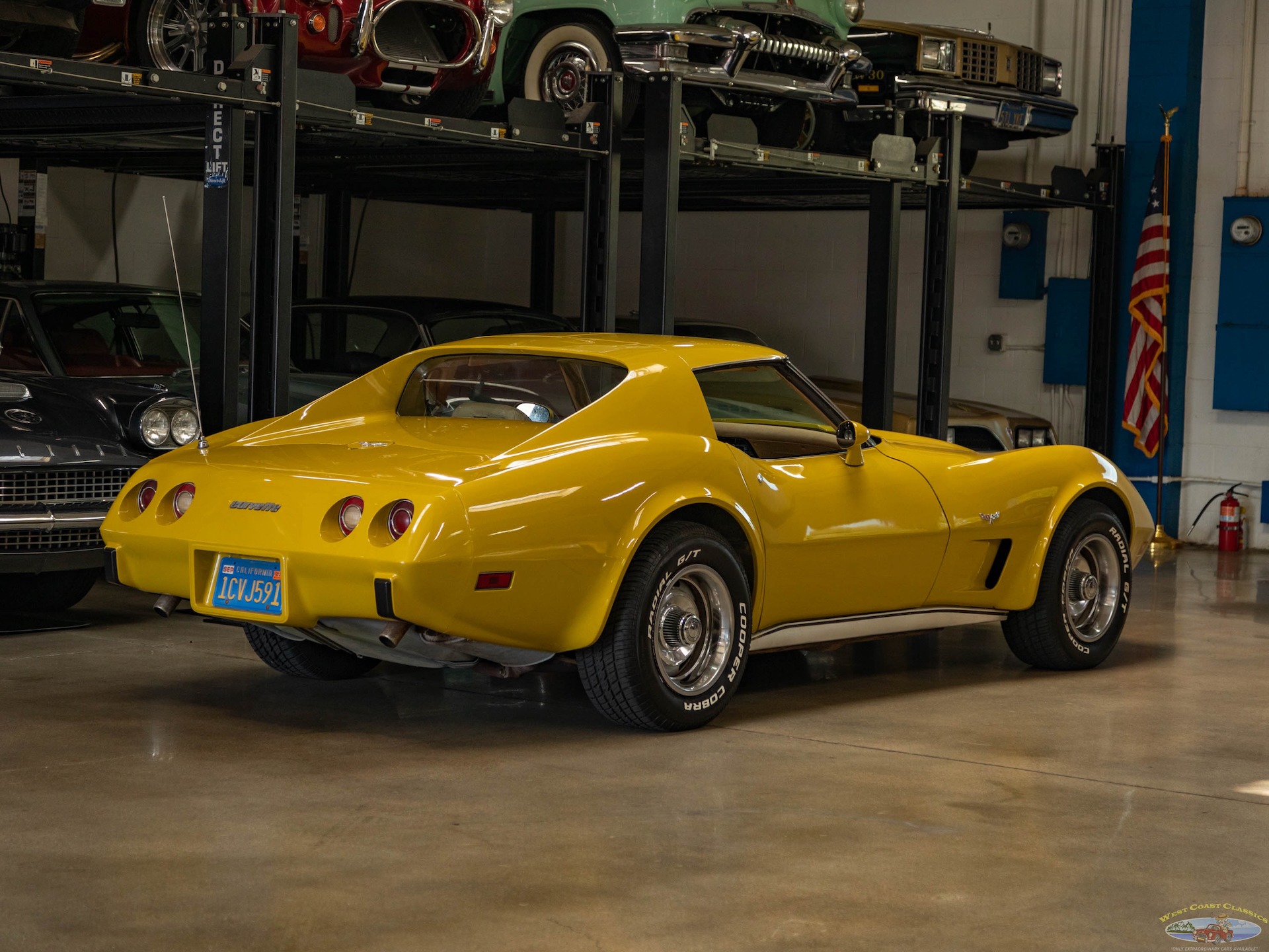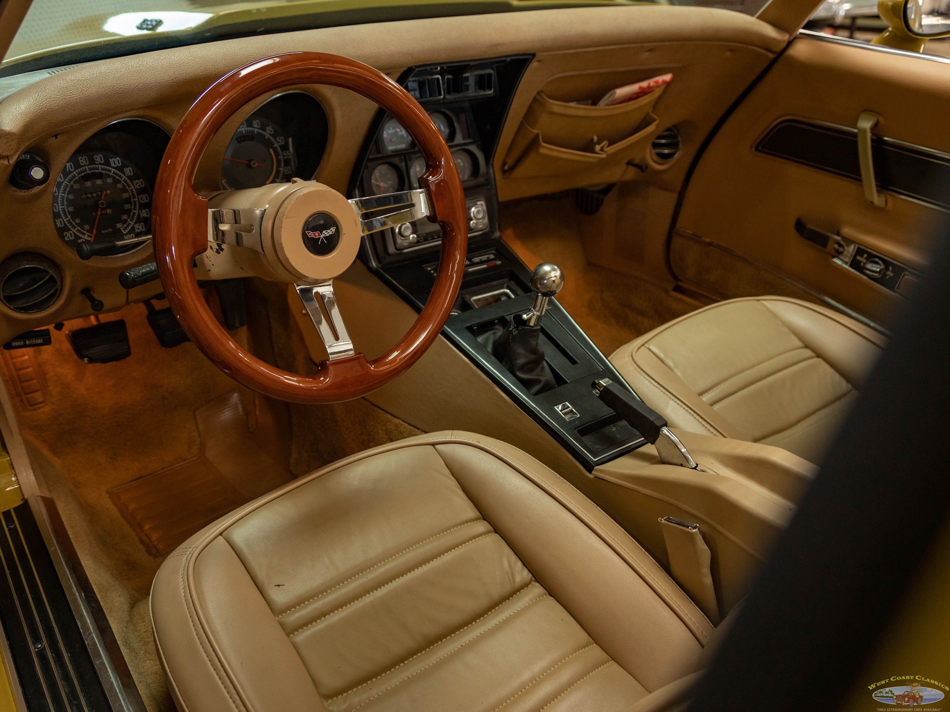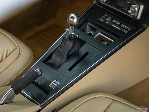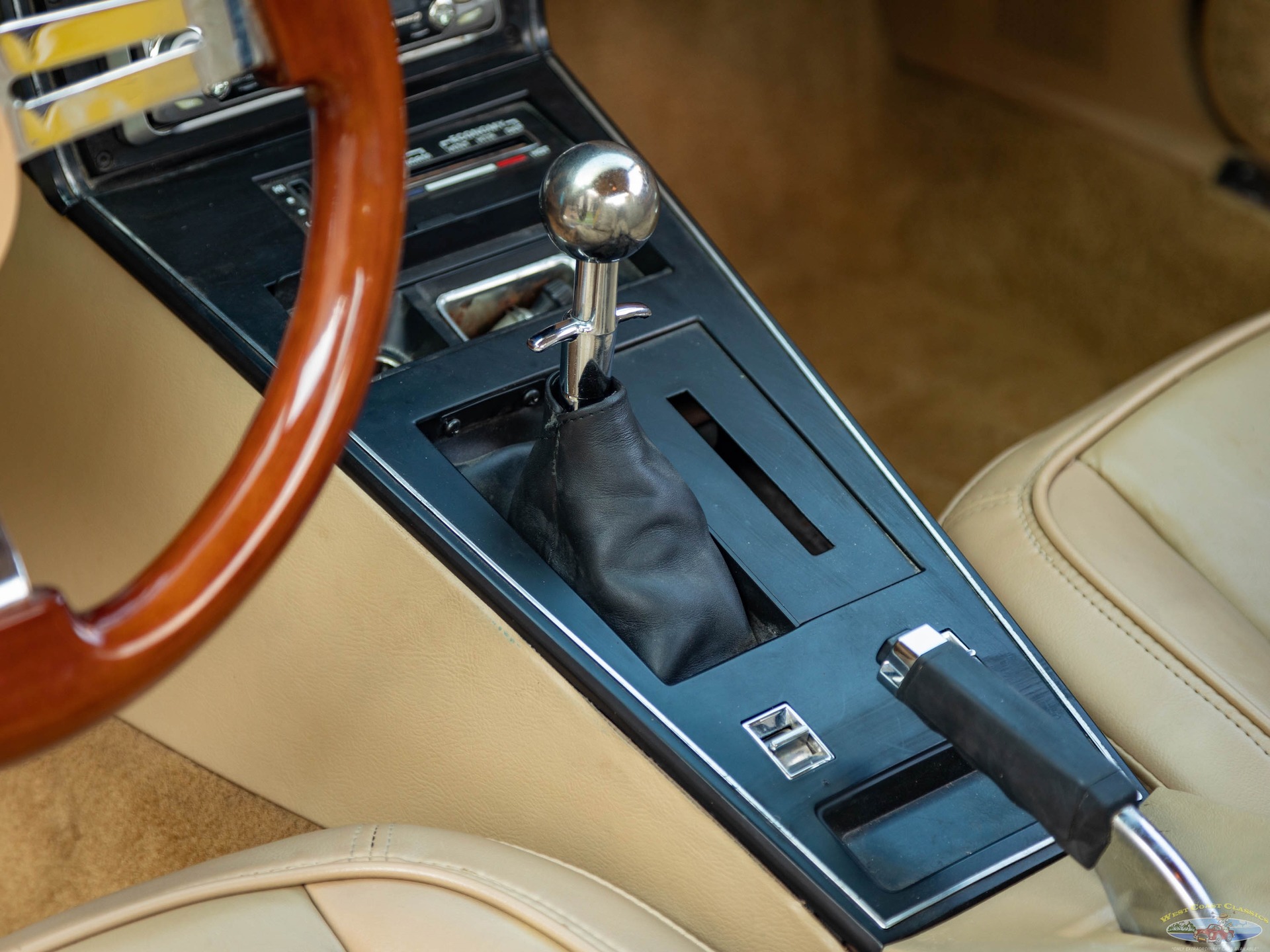 After Corvette's various legendary big block 396 with 425HP & the various 427 engines of the sixties, including the limited production L88 and then eventually the LS6 454 in 1971, Chevrolet continued production into the early seventies with the big block engine but by 1975 it was dropped from the Corvette range, as along with the rest of the industry, de-tuning to meet increasingly strict emissions testing regulations legislated out of existence virtually every American high performance car by the mid-seventies, with the Corvette alone remaining the almost sole choice for the muscle car enthusiasts. And so the Corvette continued with a pair of small block V8 engines, the standard 350 V8 and the obviously more desirable and upgraded high performance L82 with performance oriented rear axle ratios. With its strong torque output and relatively light weight, this Corvette still provided strong performance and thrilling driving dynamics and equipped with this L82 option engine, the Corvette was the fastest car in the U.S until 1979, rivaled only by the limited numbers of the Pontiac 400 Trans Am 6.6L of the same year.