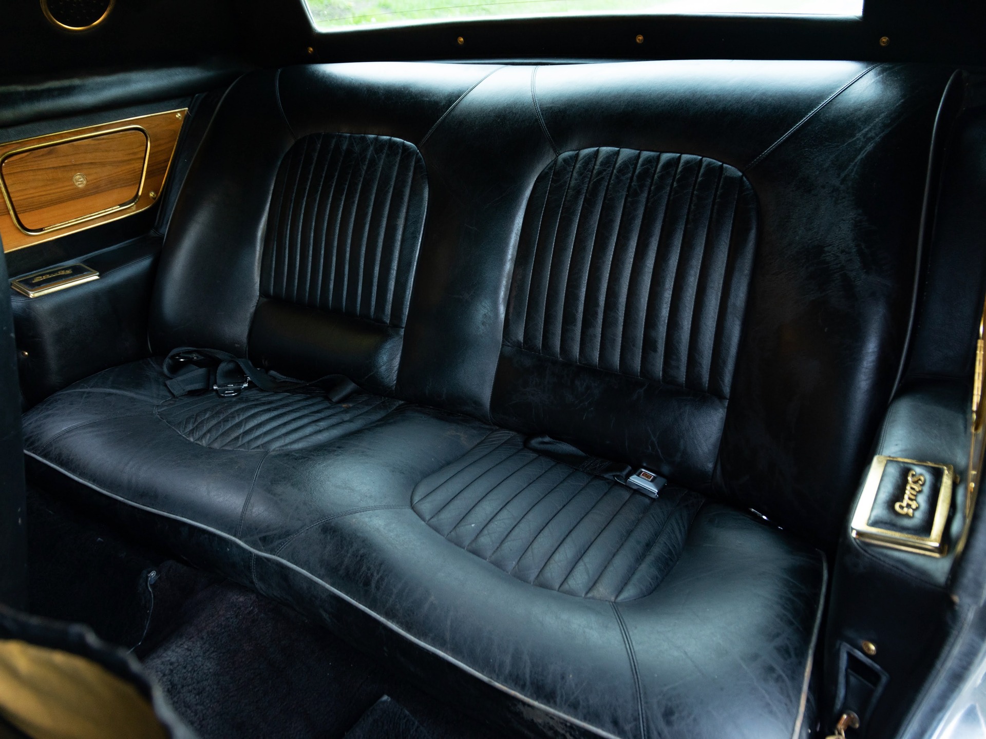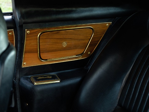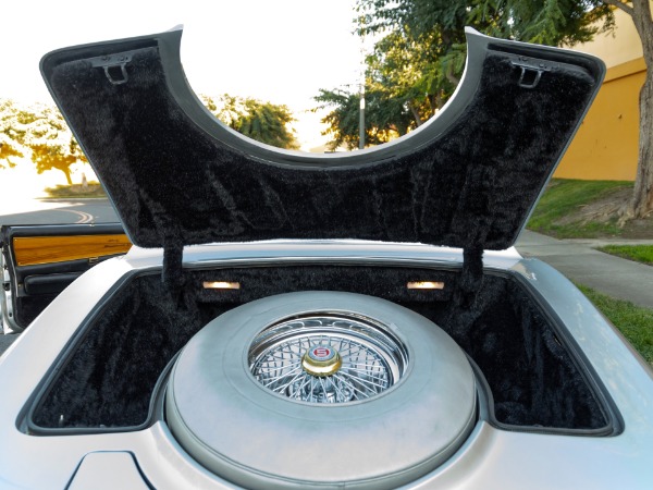 Exner's design included a spare tire that protruded through the trunk lid and freestanding headlamps. The fuel filler cap is positioned inside the spare tire on the first models. The interior includes 24-carat gold plated trim and bird's eye maple or burled walnut and redwood, Connolly leather seats and dash, instrument markings in both English and Italian, fine wool or mink carpeting and headlining, a cigar lighter, and a liquor cabinet in the back. There is a clock in the steering wheel hub on some later models. Other special features include automatic headlamp controls with twilight sensor, cornering lamps, bilevel automatic air conditioning, Superlift air adjustable shock absorbers, Safe-T-Track limited slip differential, an electric sunroof, cruise control, central locking, a burglar alarm, non-functional exhaust side pipes, and a high-end Lear Jet AM/FM eight-track quadraphonic sound system. The first models rolled on special 17-inch Firestone LXX run-flat tires and rims. These were taken off the market however as they turned out to be unsafe.