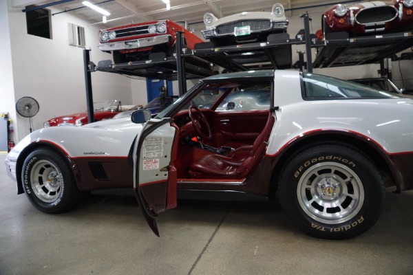 The 1982 year was the first Corvette hatchback, with a frame-less glass lift-up hatch in place of the customary fixed backlight. This particular example was factory ordered in a unique two tone 'Silver over Claret' metallic paint accented by Red Sports Stripes. Alloy wheels and removable glass roof panels were added to this unique car. The body-color front bumper with Sports Striping also had a built in air dam. Also standard were concealed wipers, time-delay courtesy lamps, headlamp on reminder, lighted visor vanity mirror, a 7,000 rpm tachometer, an analog clock with sweep second hand, a lighter and a trip odometer and a 'Cross-Fire' TBI fuel injected engine.