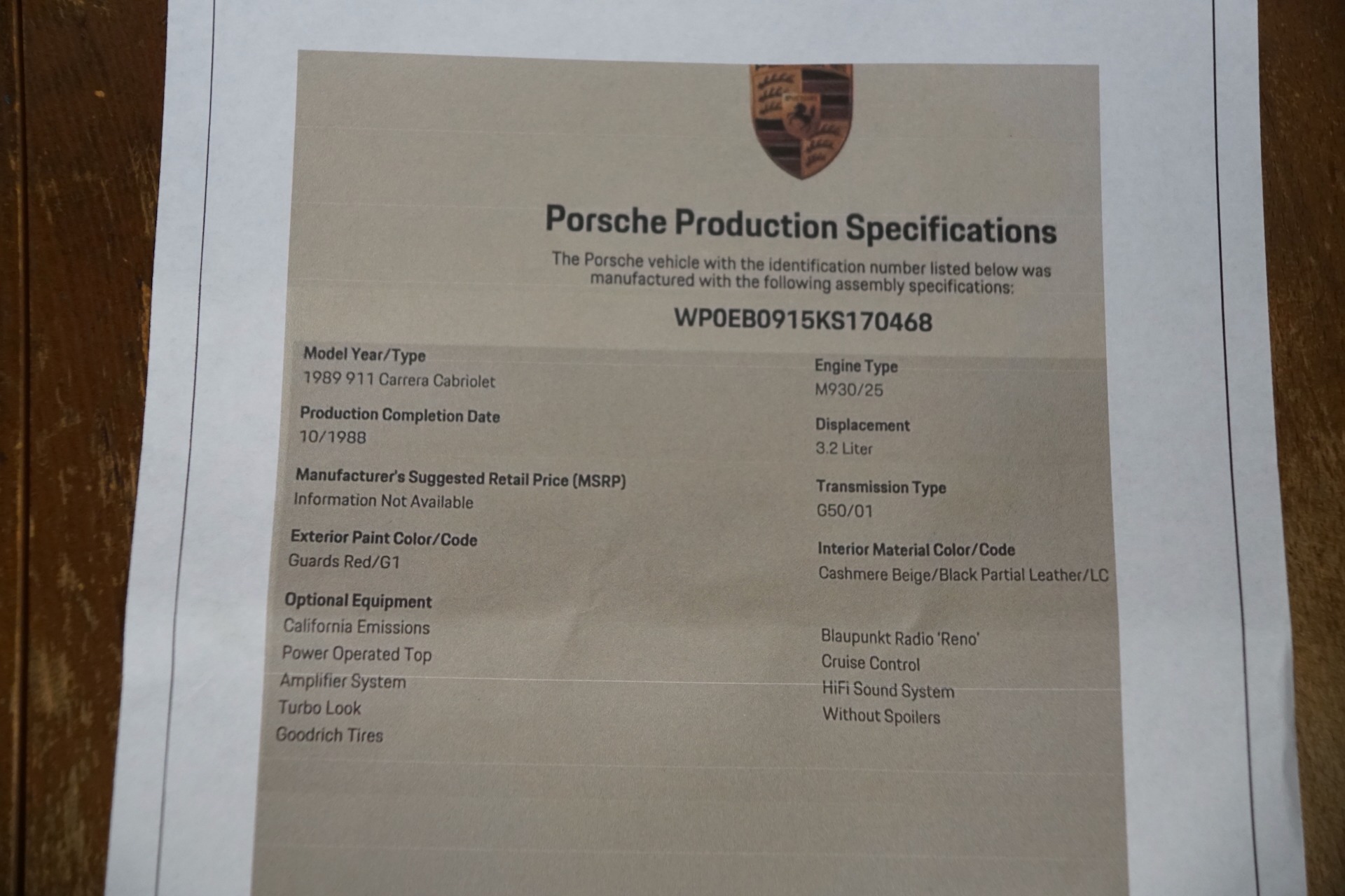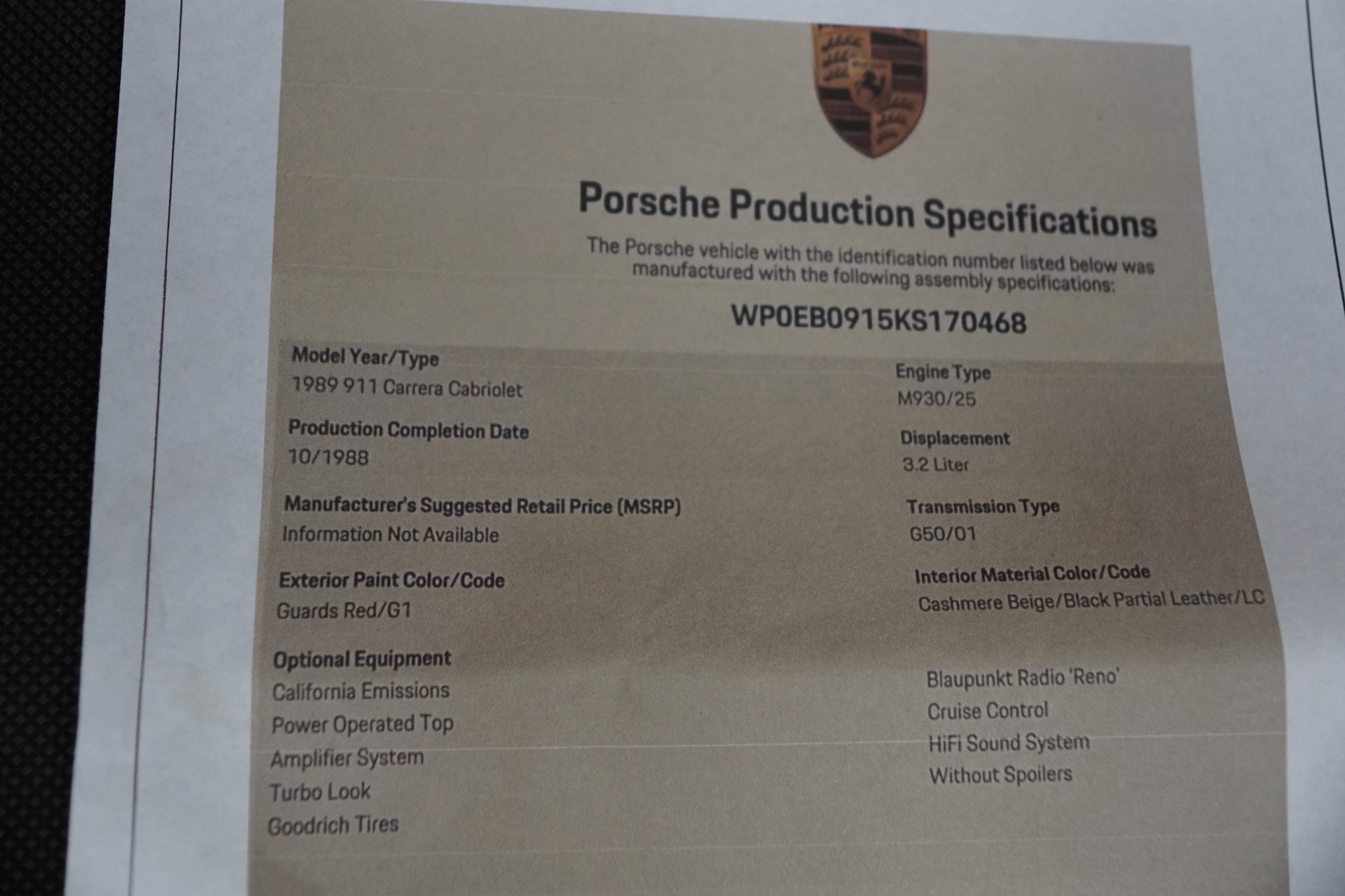 PORSCHE CERTIFICATE OF AUTHENTICITY