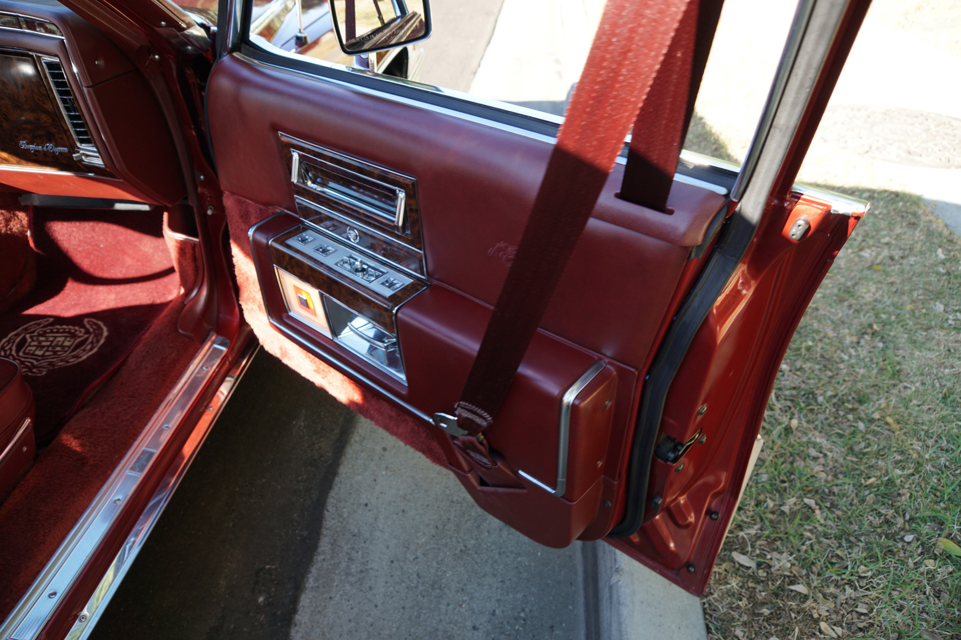 Significant changes took place in the Brougham's interior. Two new colors for the Primavera cloth upholstery, Antelope and Dark Maple Red, were introduced. A total of four colors were offered. The same colors were added to the standard Brougham's grain-leather interior, making for a total availability of seven colors. Joining Antelope and Dark Maple Red was black for the d'Elegance Brougham's Sierra grain leather interior, which was also available in three other colors. Revisions to the Brougham's seating areas consisted of the replacement of Royal Prima with Primavera cloth, outboard front seat cushions contoured on the standard Brougham for increased lateral support, a new standard front seat center armrest with storage compartment, and change in the d'Elegance seat to a 55/45 configuration. Carpeted rubber-backed floor mats with retention needles were now used. New standard automatic safety belts for driver and right front passenger were installed. A black walnut burl trim was used for the instrument panel, doors and steering wheel horn pad. Both a power driver seat recliner and an electronic digital instrument panel were now standard. An improve electronic climate control system with three automatic and two manual settings was adopted. The standard AM/FM radio with a preset graphic equalizer, cassette tape player and signal seeking and scanner feature with digital display was also upgraded. Both a new compact disc player and an electrochromic inside rearview mirror were optional. Items previously optional that were made standard for 1991 were as follows: side and deck lid accent striping, rear window defogger and heated outside mirrors door edge guards, carpeted floor mats, front license mounting provisions and trunk mat.