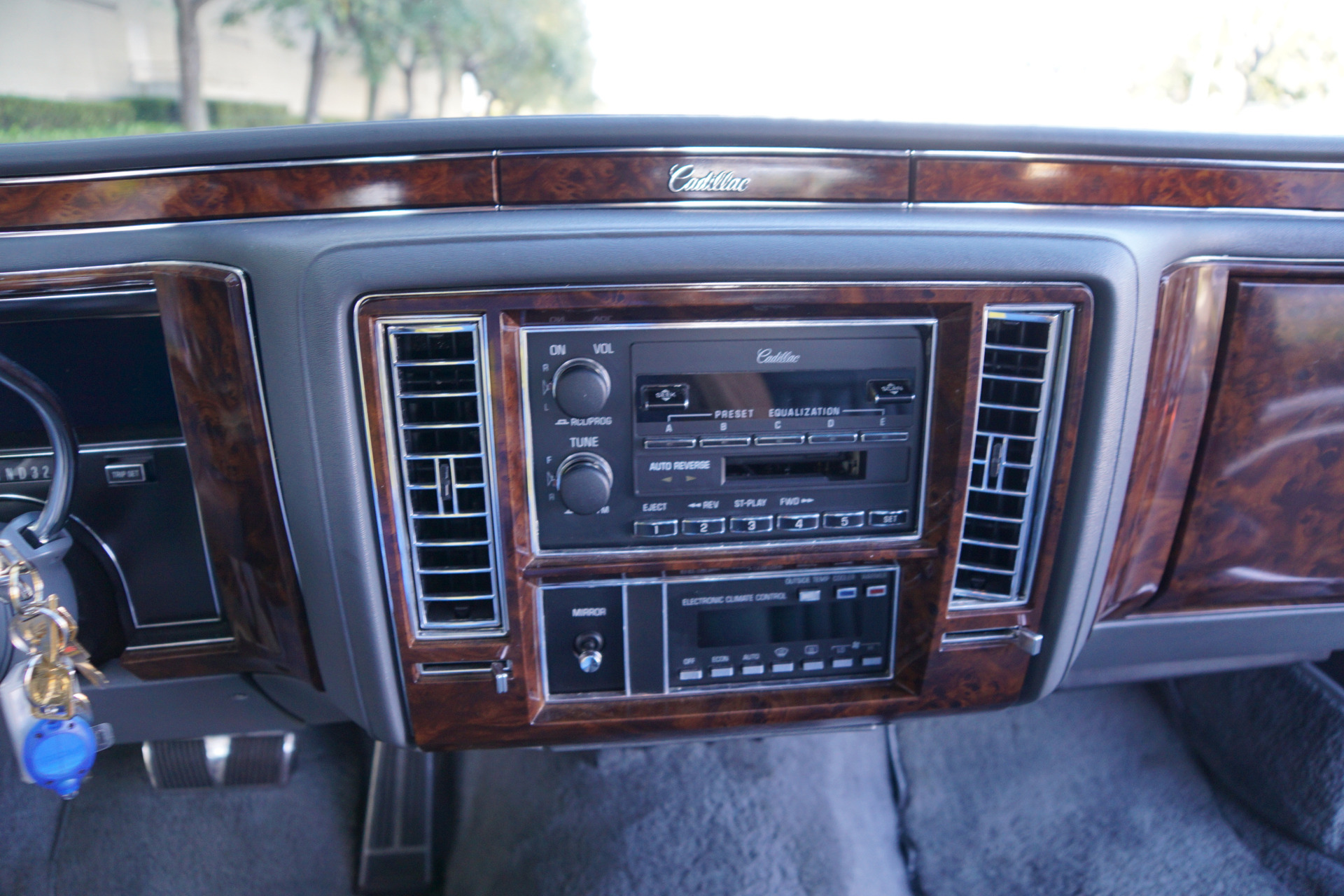 Significant changes took place in the Brougham's interior. Two new colors for the Primavera cloth upholstery, Antelope and Dark Maple Red, were introduced. A total of four colors were offered. The same colors were added to the standard Brougham's grain-leather interior, making for a total availability of seven colors. Joining Antelope and Dark Maple Red was black for the d'Elegance Brougham's Sierra grain leather interior, which was also available in three other colors. Revisions to the Brougham's seating areas consisted of the replacement of Royal Prima with Primavera cloth, outboard front seat cushions contoured on the standard Brougham for increased lateral support, a new standard front seat center armrest with storage compartment, and change in the d'Elegance seat to a 55/45 configuration. Carpeted rubber-backed floor mats with retention needles were now used. New standard automatic safety belts for driver and right front passenger were installed. A black walnut burl trim was used for the instrument panel, doors and steering wheel horn pad. Both a power driver seat recliner and an electronic digital instrument panel were now standard. An improve electronic climate control system with three automatic and two manual settings was adopted. The standard AM/FM radio with a preset graphic equalizer, cassette tape player and signal seeking and scanner feature with digital display was also upgraded. Both a new compact disc player and an electrochromic inside rearview mirror were optional. Items previously optional that were made standard for 1991 were as follows: side and deck lid accent striping, rear window defogger and heated outside mirrors door edge guards, carpeted floor mats, front license mounting provisions and trunk mat.