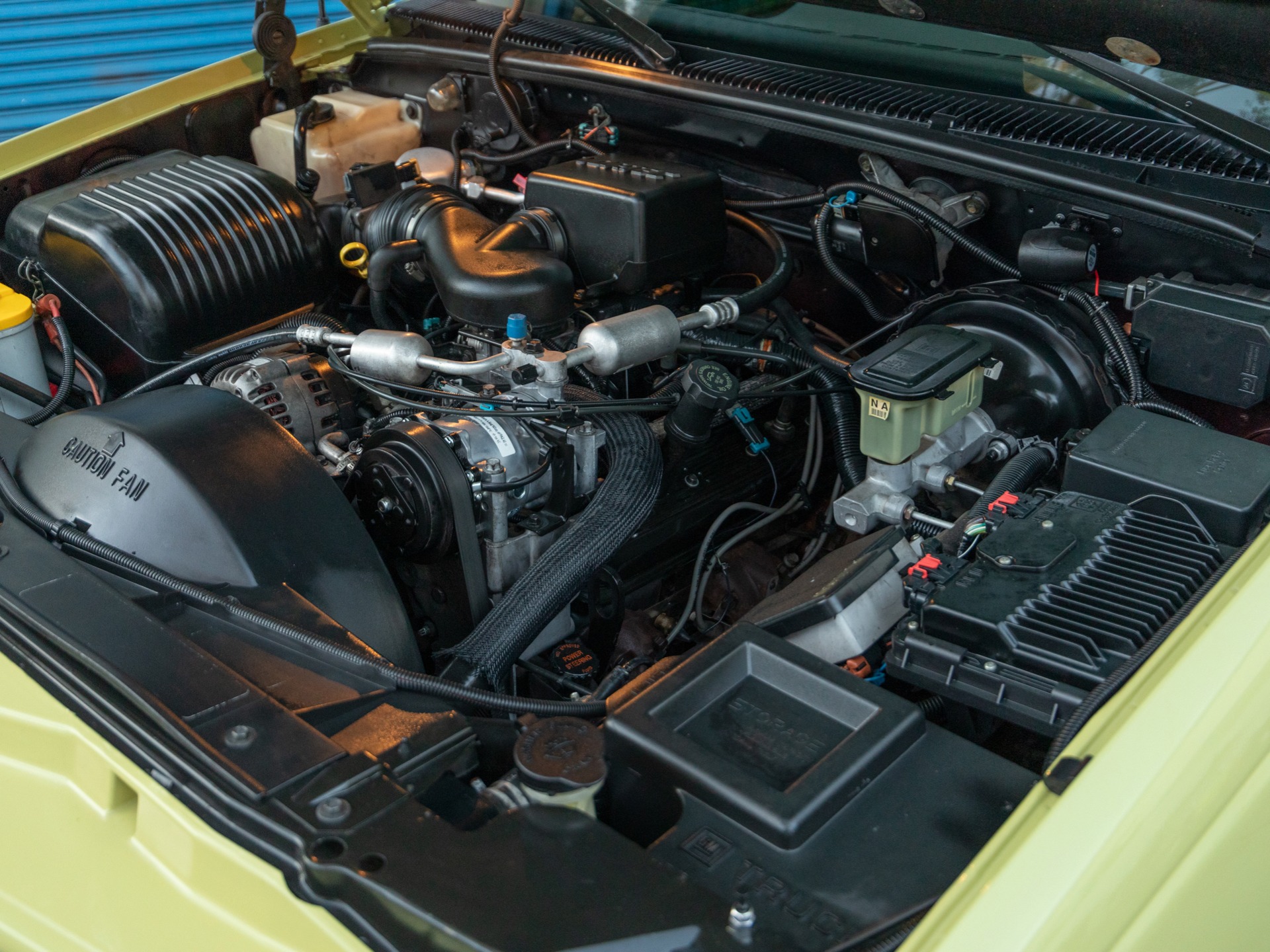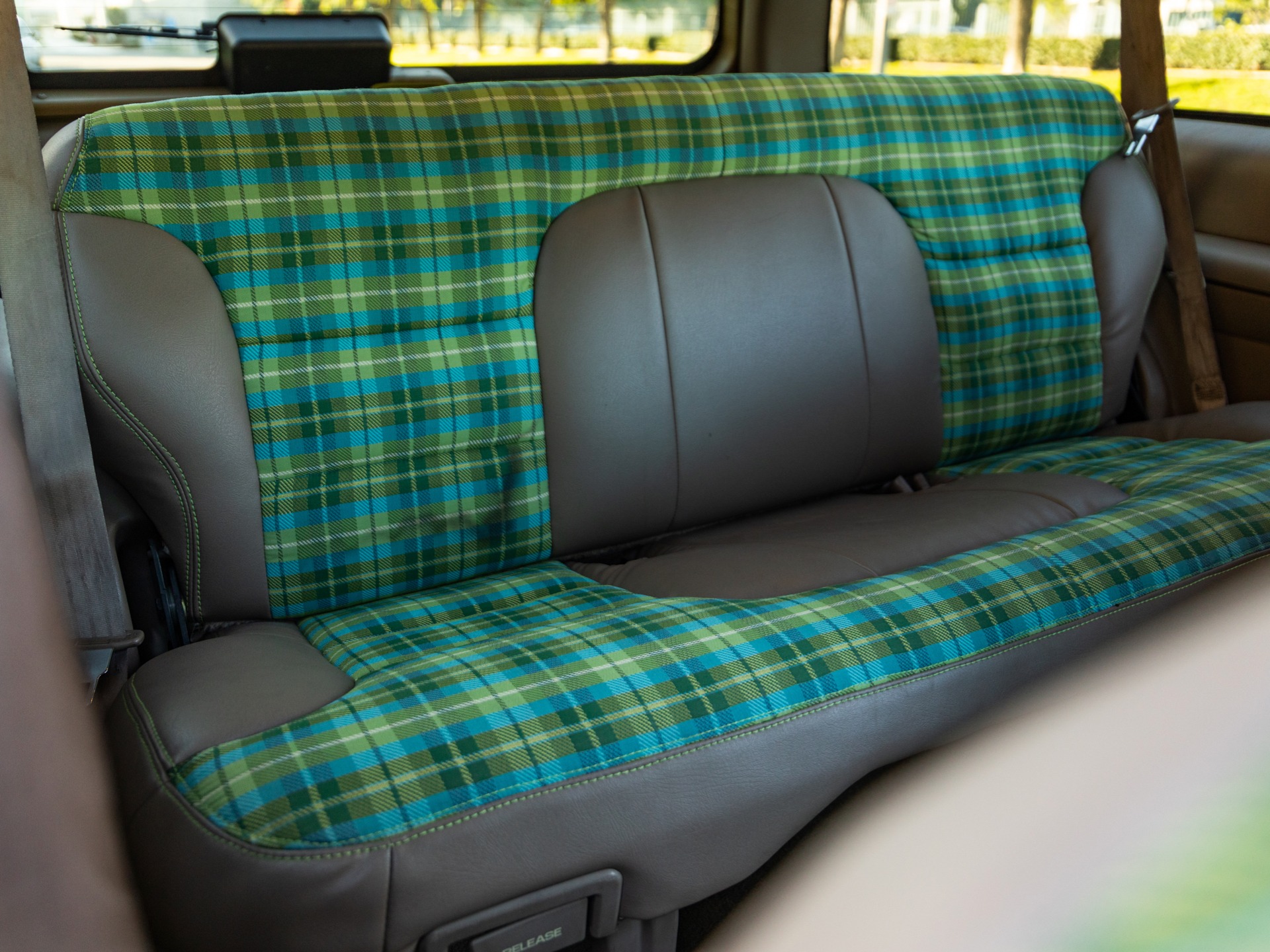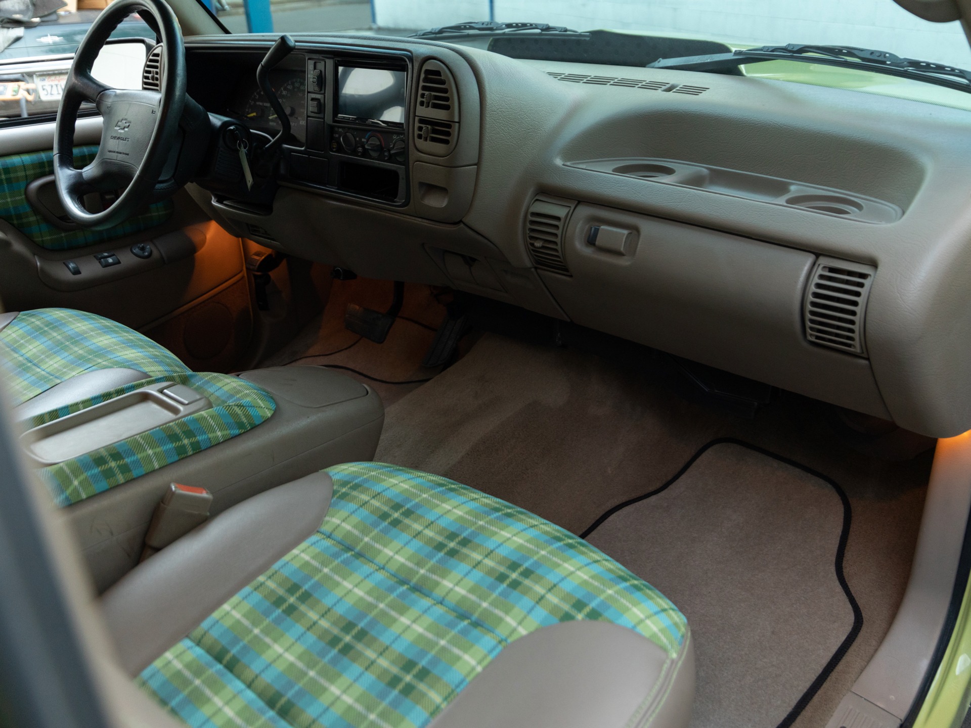 The engine had a full top end rebuild, new intake and gaskets, fuel pump, 02 sensor, and new injectors. A brand new 4L60e transmission was installed, and the entire A/C system upgraded to new R134a throughout. A new custom exhaust was installed as well, and all new plugs/wires/etc, Lowboy Motorsports installed the chassis, and it was cleaned and rebuilt with a BellTech 5/7 static drop from Pro Performance, Drop steering rack and alignment, performance shocks, drop spindles, driveline correctors, hangars and bump stops. The end result is an aggressive stance that still retains factory ride with much tighter handling. New brake pads and rotors were then installed along with a full clean and adjust out back, the whole interior was redone from the carpet to the headliner, and trimmed out in a very striking 70's style green plaid trim.