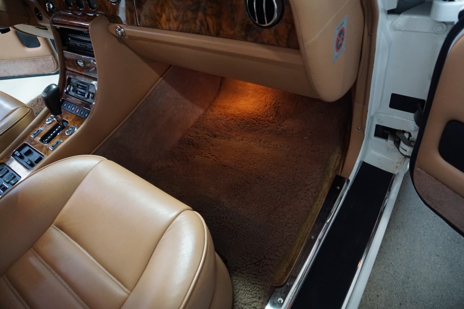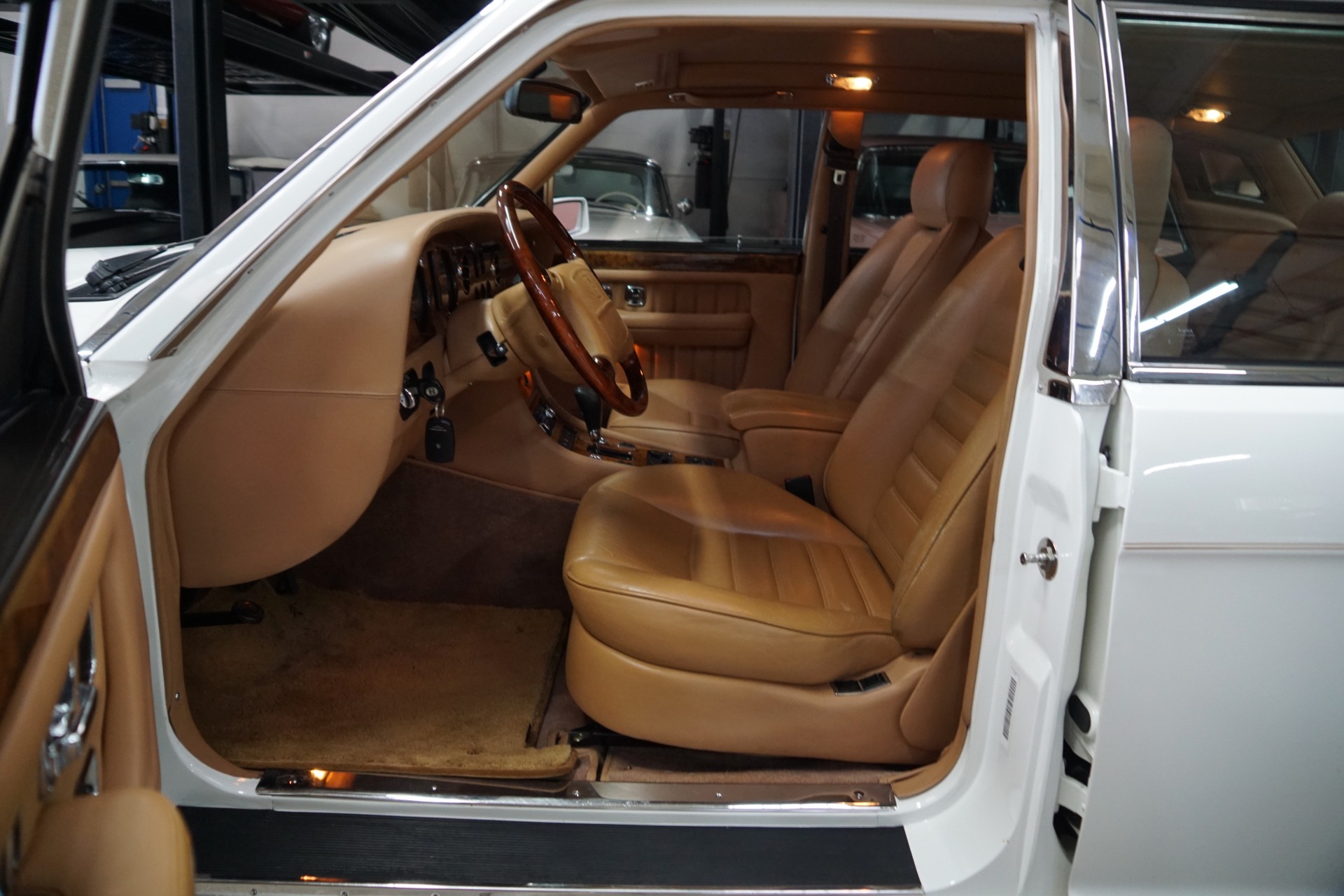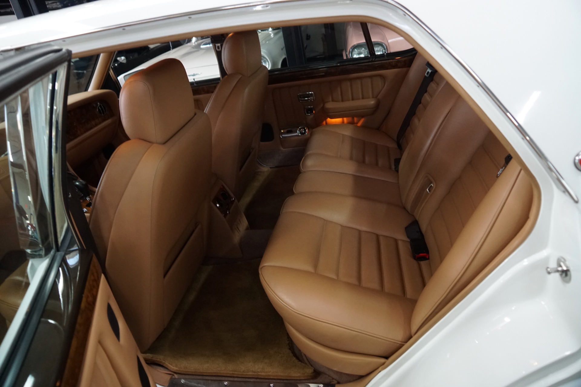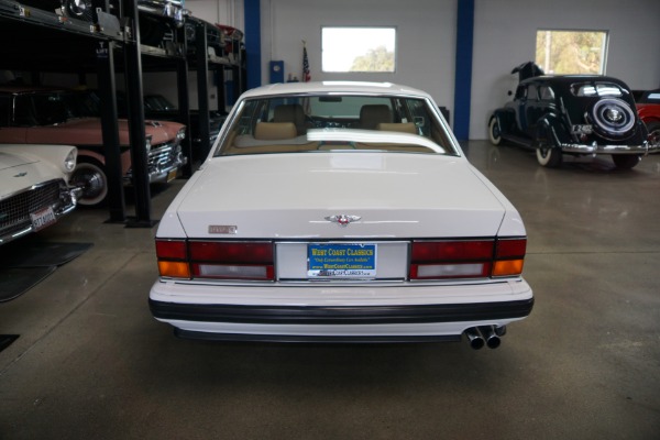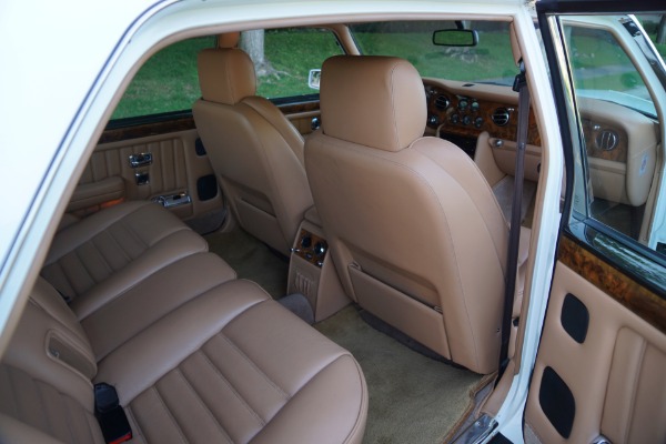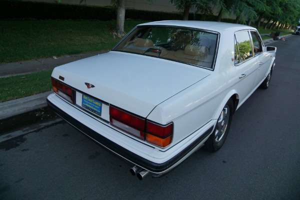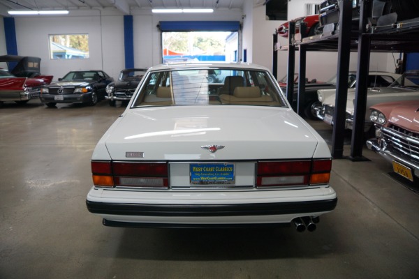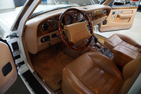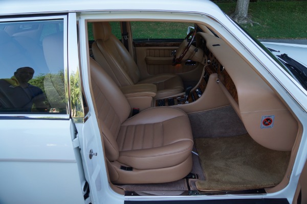 This pristine example has its original dealer maintenance booklet, owners manuals and complete tool kit included. The car has a beautiful and highly desirable all original color combination of original factory 'Acrylic White' exterior paint with original factory painted Gold pin stripes, highly striking chrome Bentley wheels and with gorgeous 'Tan' Connolly leather hides, tan leather headliner and carpeting with original factory lambswool rugs which is in virtually flawless condition throughout. The original paint still reflects like glass and all the chrome work including the front grille and bumpers is absolutely outstanding. The leather seats, dashboard and headliner show virtually no signs of any wear whatsoever. Obviously always garaged with no accident history and obviously owned by only very careful and meticulous drivers since new - never abused with a clean Carfax!
