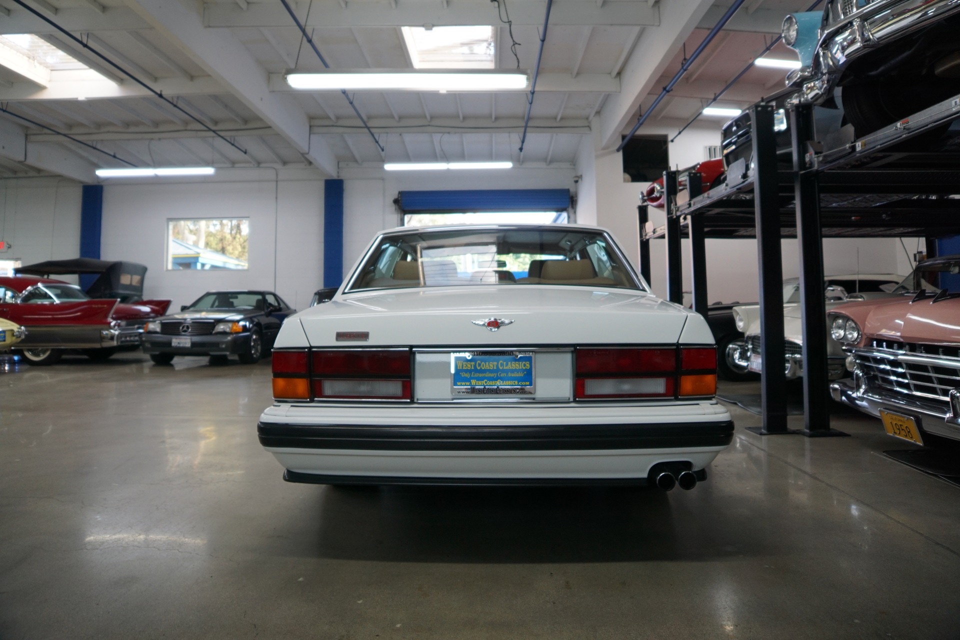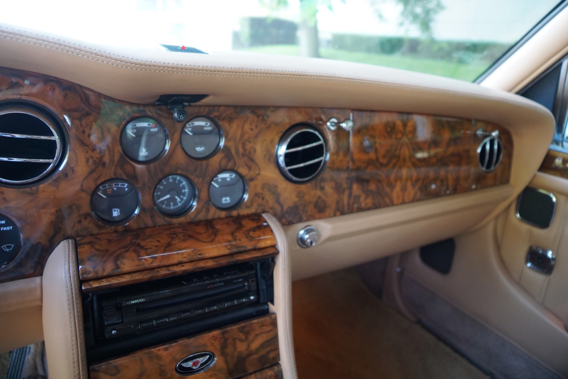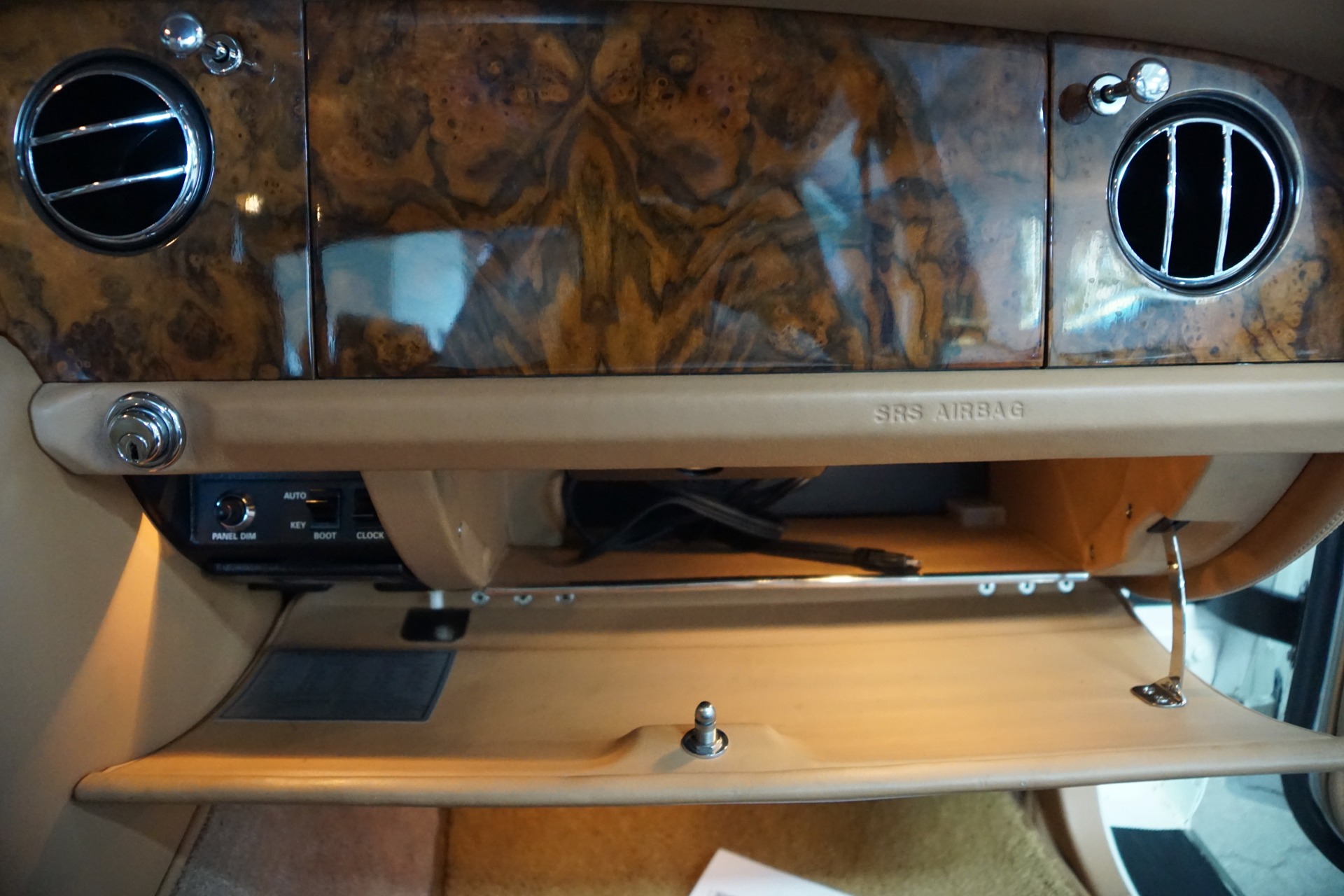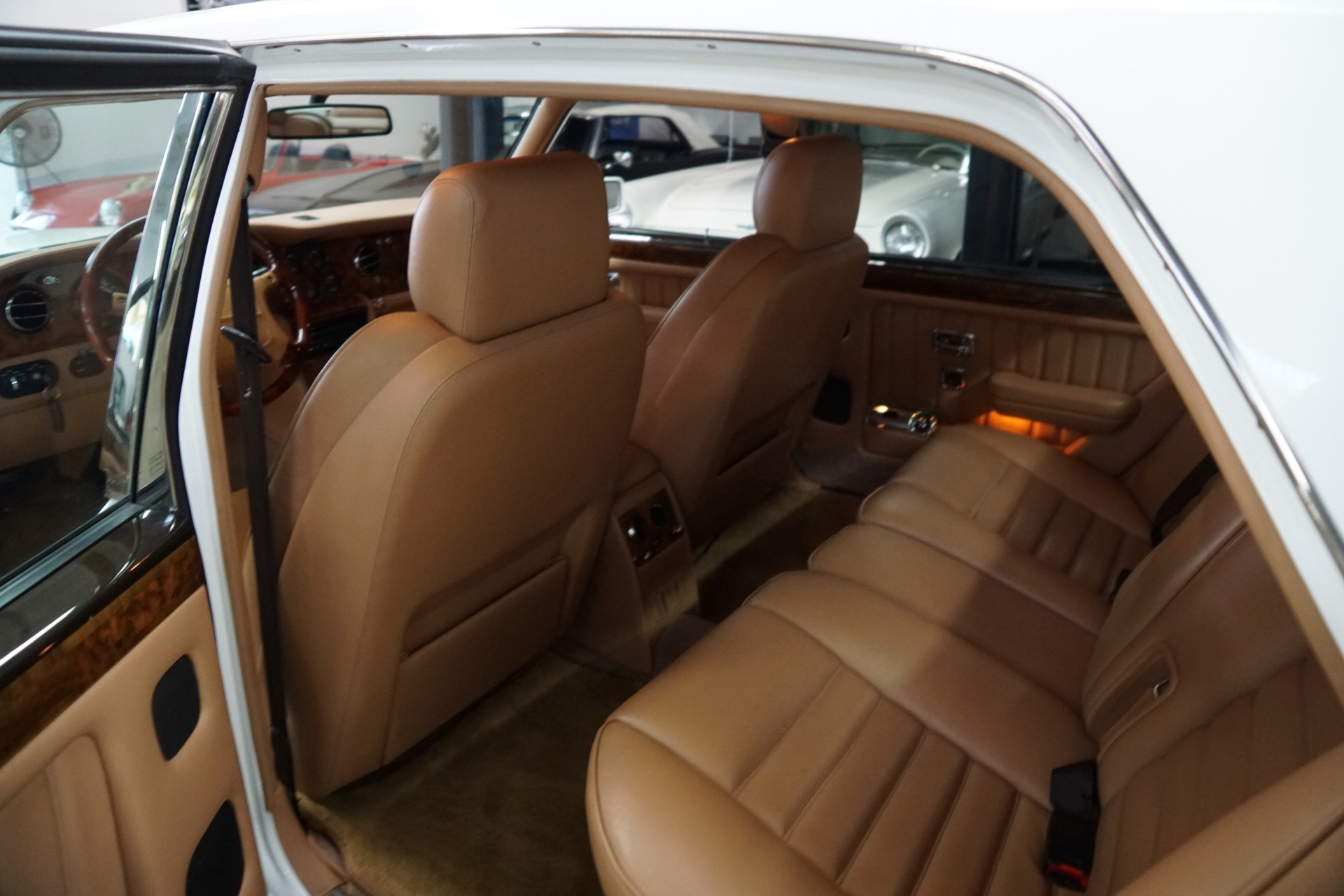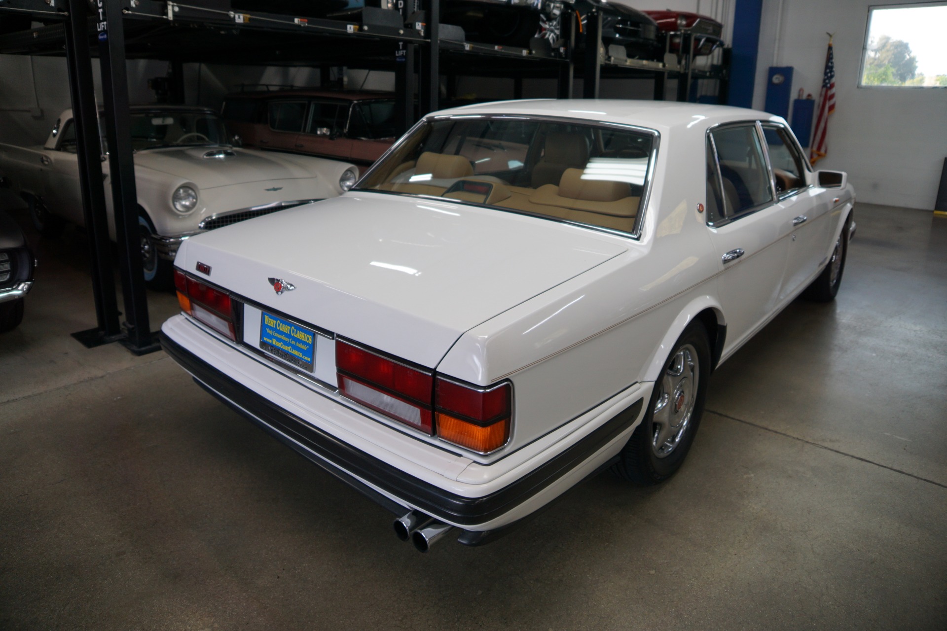 This pristine example has its original dealer maintenance booklet, owners manuals and complete tool kit included. The car has a beautiful and highly desirable all original color combination of original factory 'Acrylic White' exterior paint with original factory painted Gold pin stripes, highly striking chrome Bentley wheels and with gorgeous 'Tan' Connolly leather hides, tan leather headliner and carpeting with original factory lambswool rugs which is in virtually flawless condition throughout. The original paint still reflects like glass and all the chrome work including the front grille and bumpers is absolutely outstanding. The leather seats, dashboard and headliner show virtually no signs of any wear whatsoever. Obviously always garaged with no accident history and obviously owned by only very careful and meticulous drivers since new - never abused with a clean Carfax!