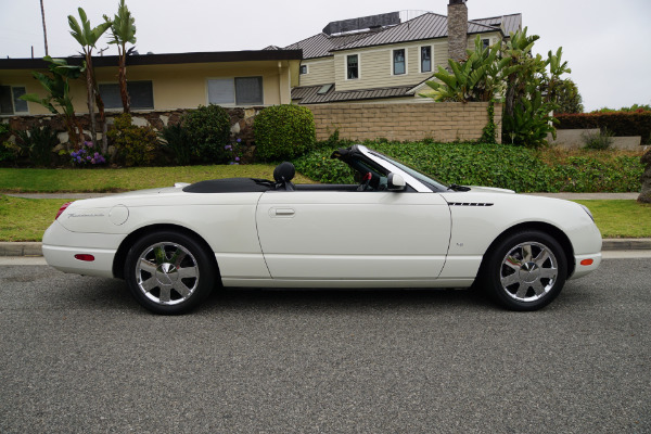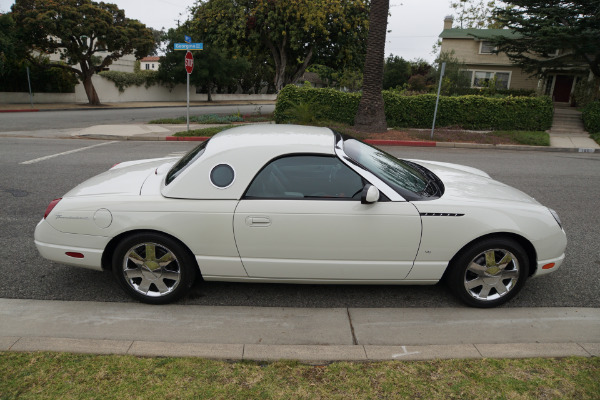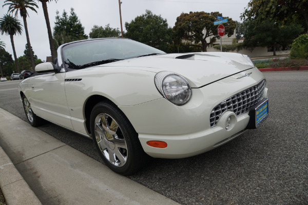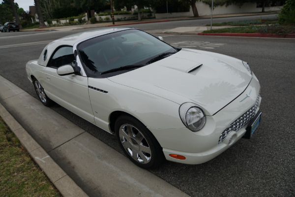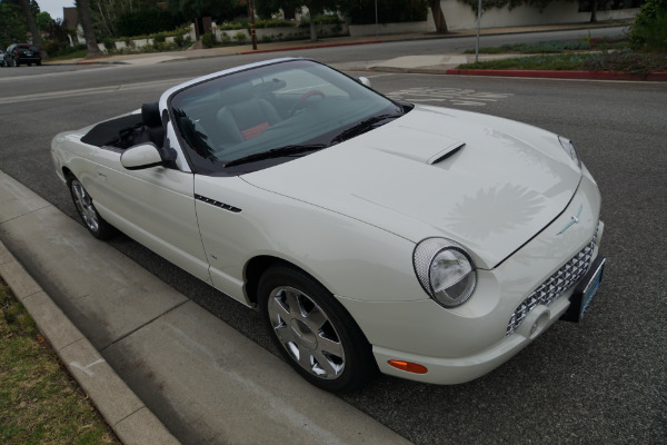 West Coast Classics are proud to present an absolutely exceptional and stunning example of this 2003 Ford Thunderbird Premium (130A) 3.9L V8 Convertible Roadster with its original factory white hardtop, black power soft top, 'Torch Red Accent' leather interior and loaded with all the modern days options of a luxury 'modern day classic' sports car and in the striking and very desirable color of original 'Whisper White' factory paint with a virtually still flawless 'Torch Red Accent' leather interior and a remarkable 10,073 original miles!