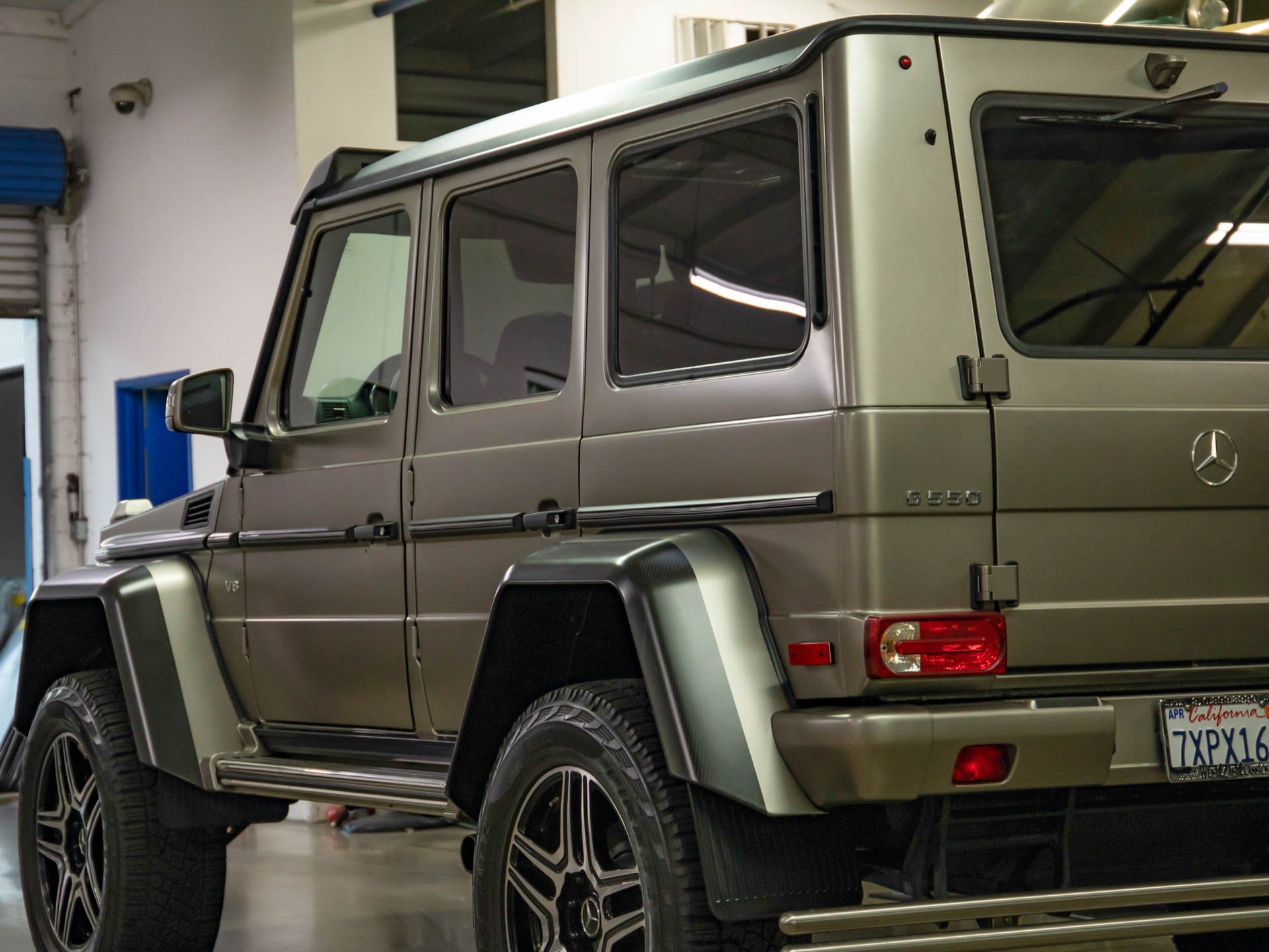The 2017 Mercedes-Benz G550 44 is one of approximately 300 examples built for the US market and is finished in 'Designo Graphite' [Gray] over 'Designo Black' Nappa Leather and Dinamica upholstery. Power comes from a twin-turbocharged 4.0-liter V8 mated to a seven-speed automatic transmission, a dual-range transfer case, and three locking differentials. Additional equipment includes portal axles, dual coilover suspension, side exhaust outlets, 22 alloy wheels, carbon-fiber wheel arches, LED auxiliary lighting, a sunroof, climatized and power-adjustable front seats, heated rear seats, COMAND infotainment with navigation, and a Harman-Kardon LOGIC7 sound system.